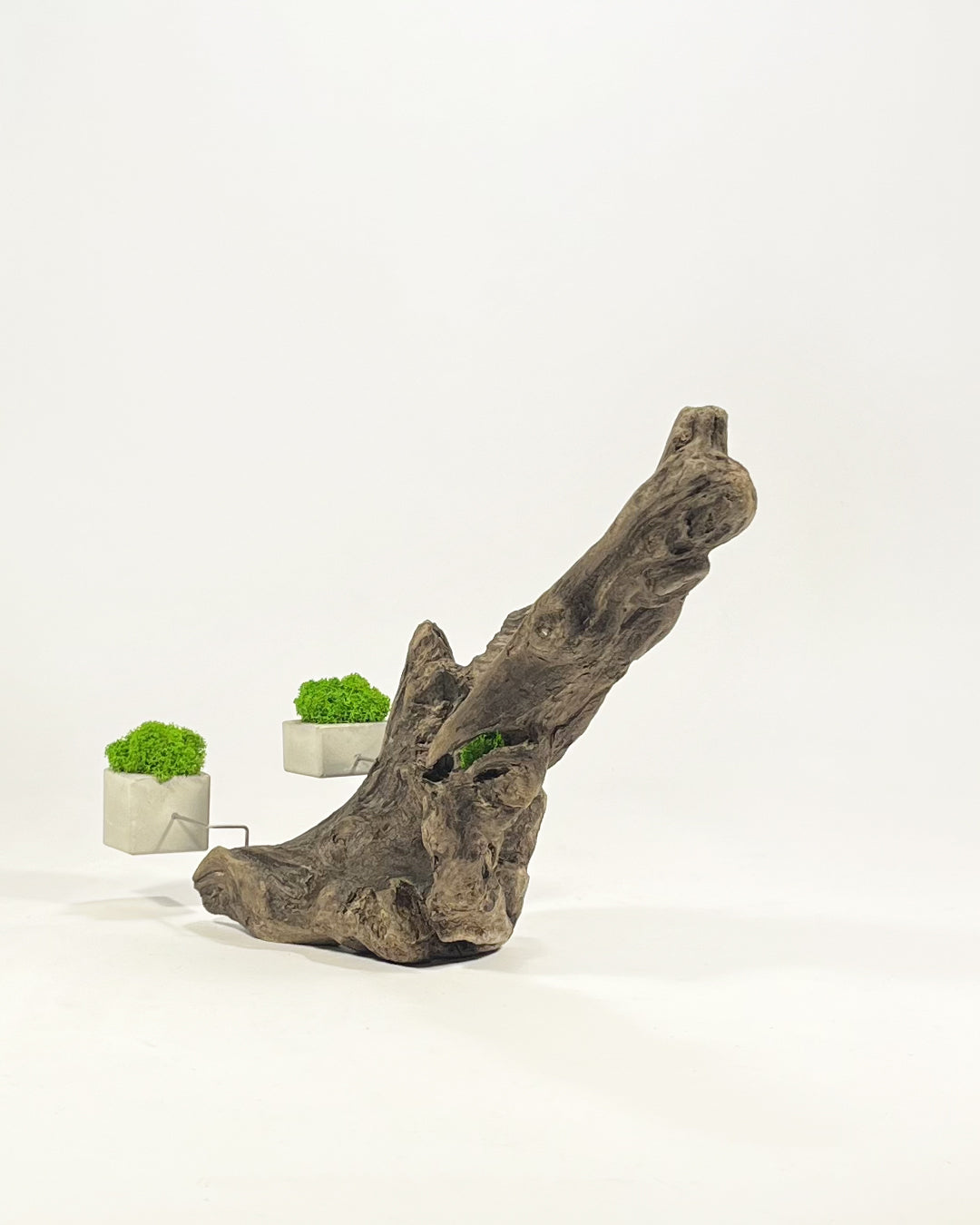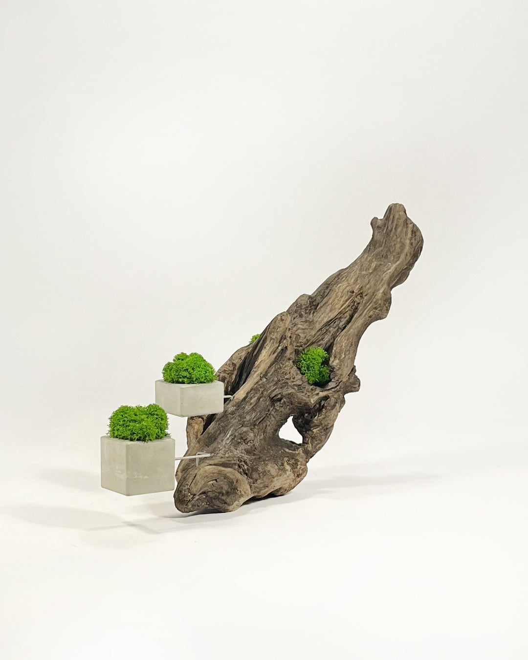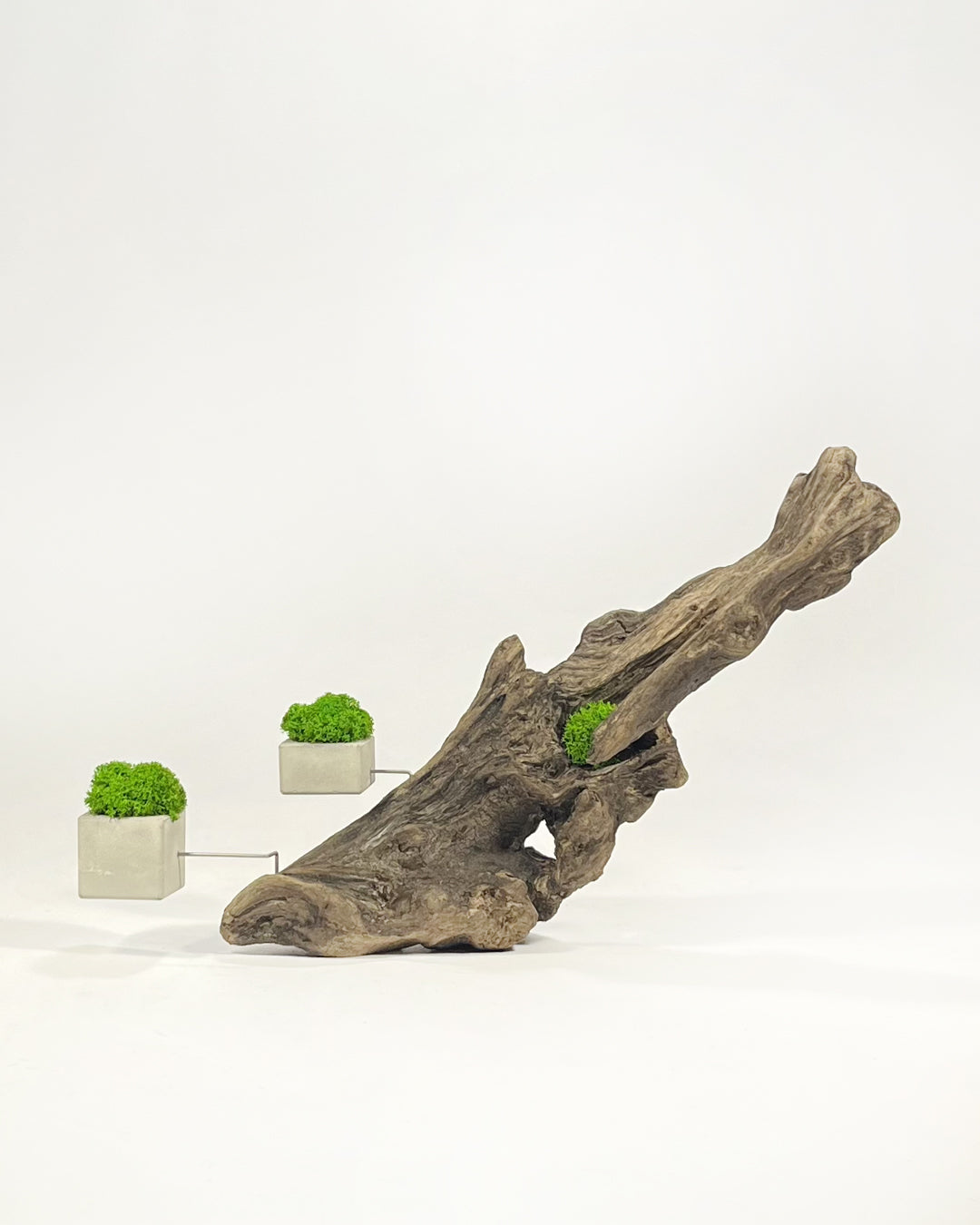 Legni di mare, acciaio, muschio stabilizzato (Moss) e forme geometriche in cemento fungono da rispettivi contrappesi in un gioco di equilibrio tra naturale ed artificiale dove a vincere è solo la forza di gravità.