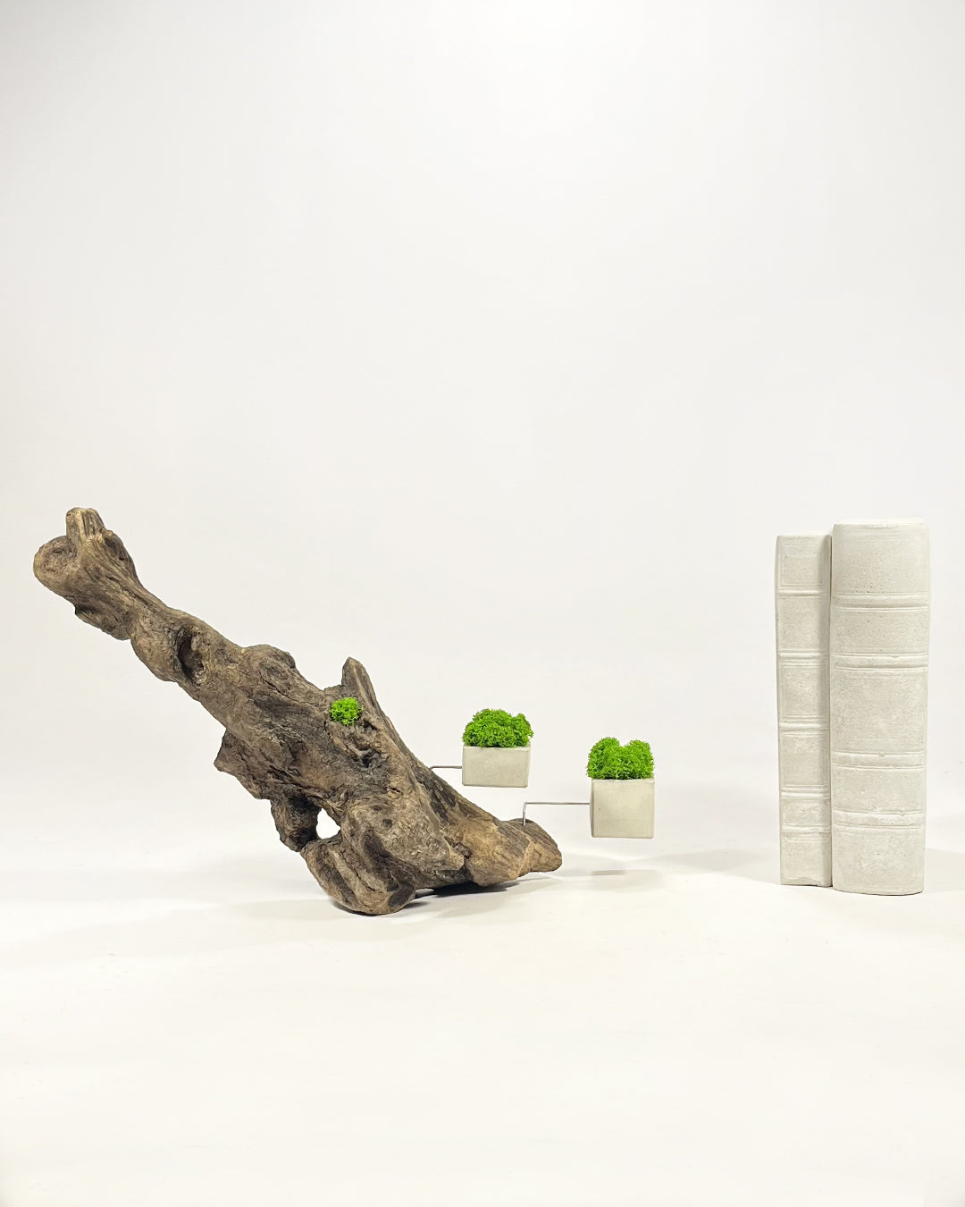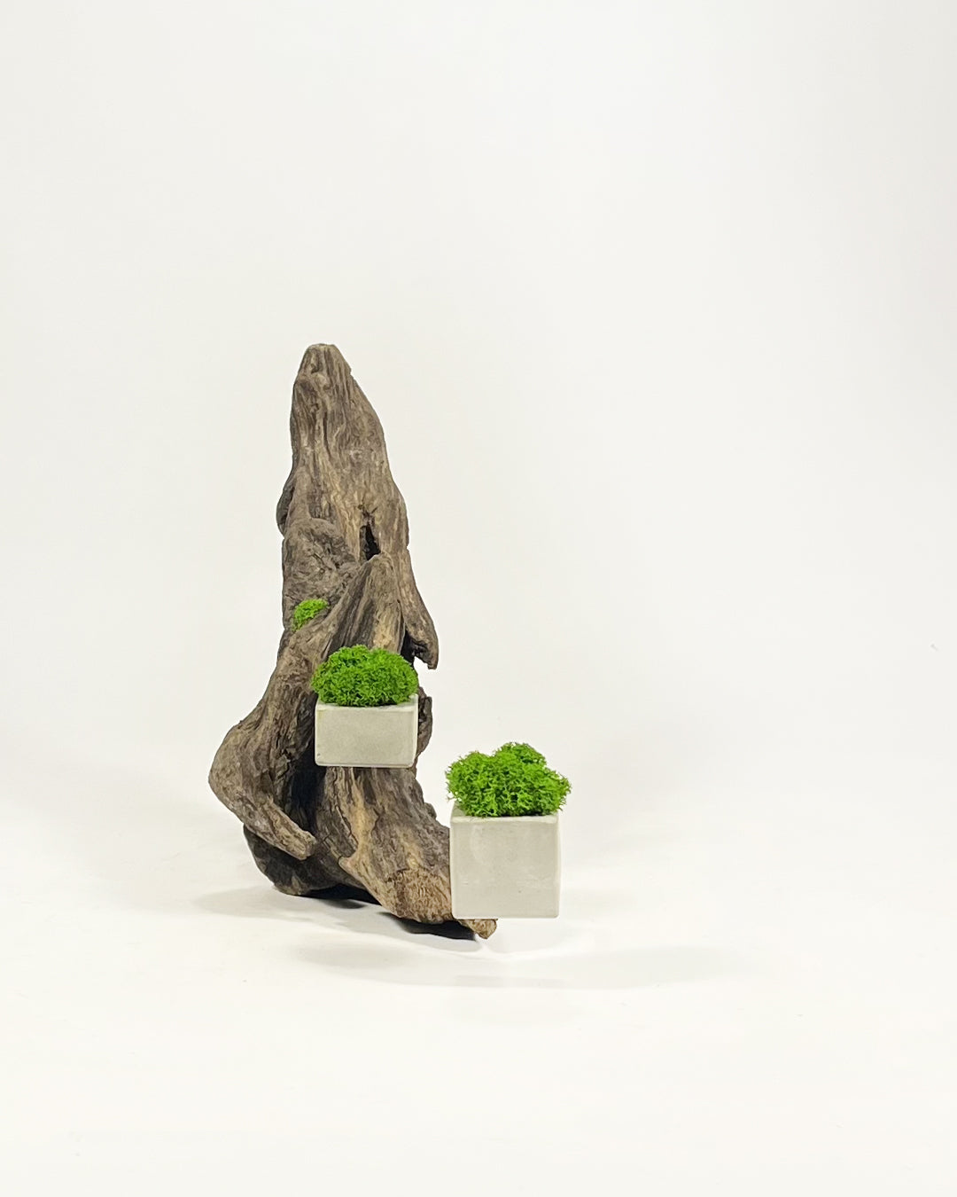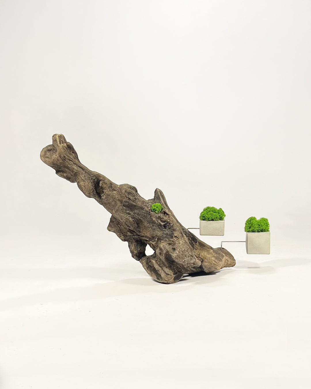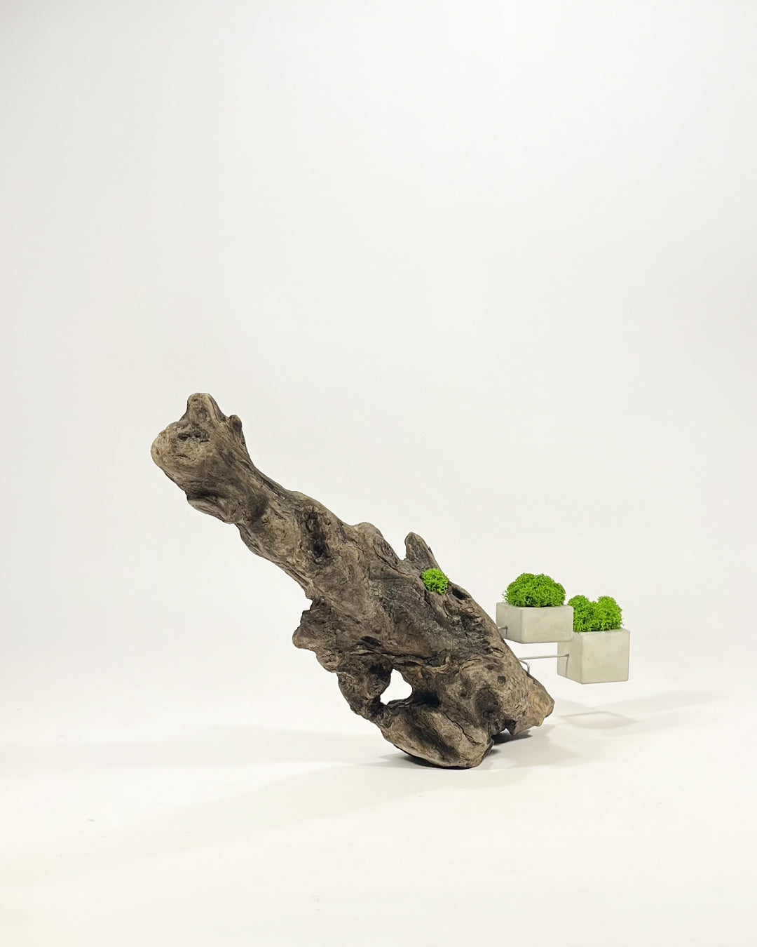 Legni di mare, acciaio, muschio stabilizzato (Moss) e forme geometriche in cemento fungono da rispettivi contrappesi in un gioco di equilibrio tra naturale ed artificiale dove a vincere è solo la forza di gravità.