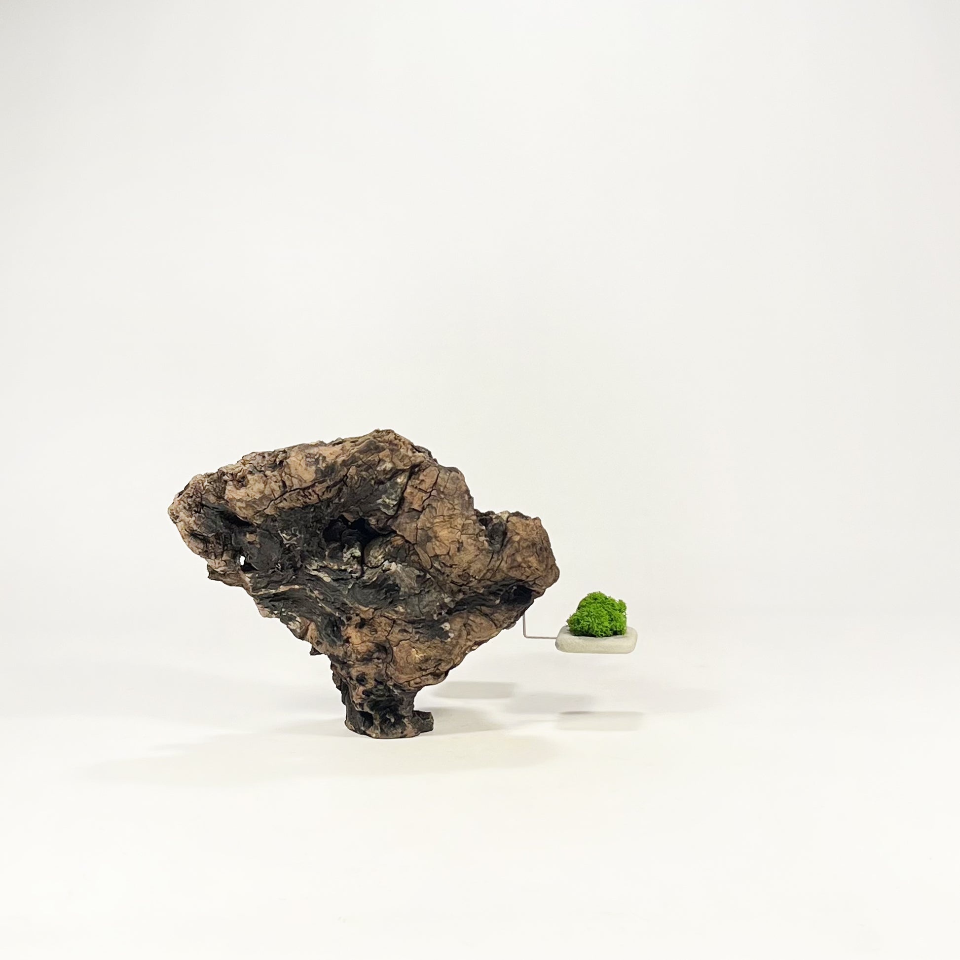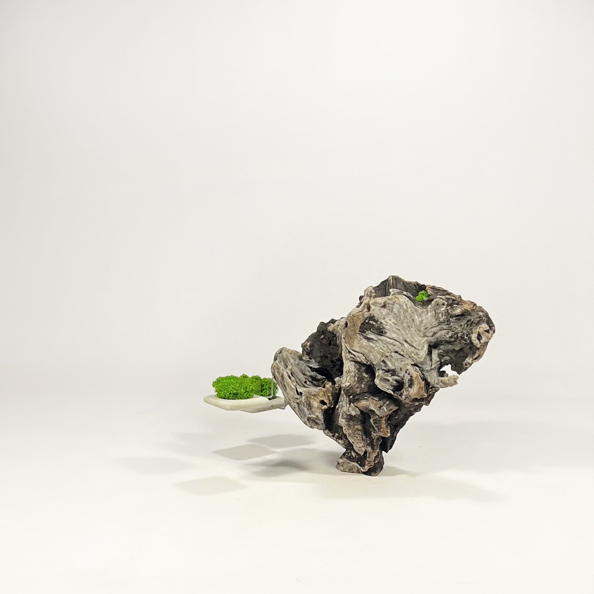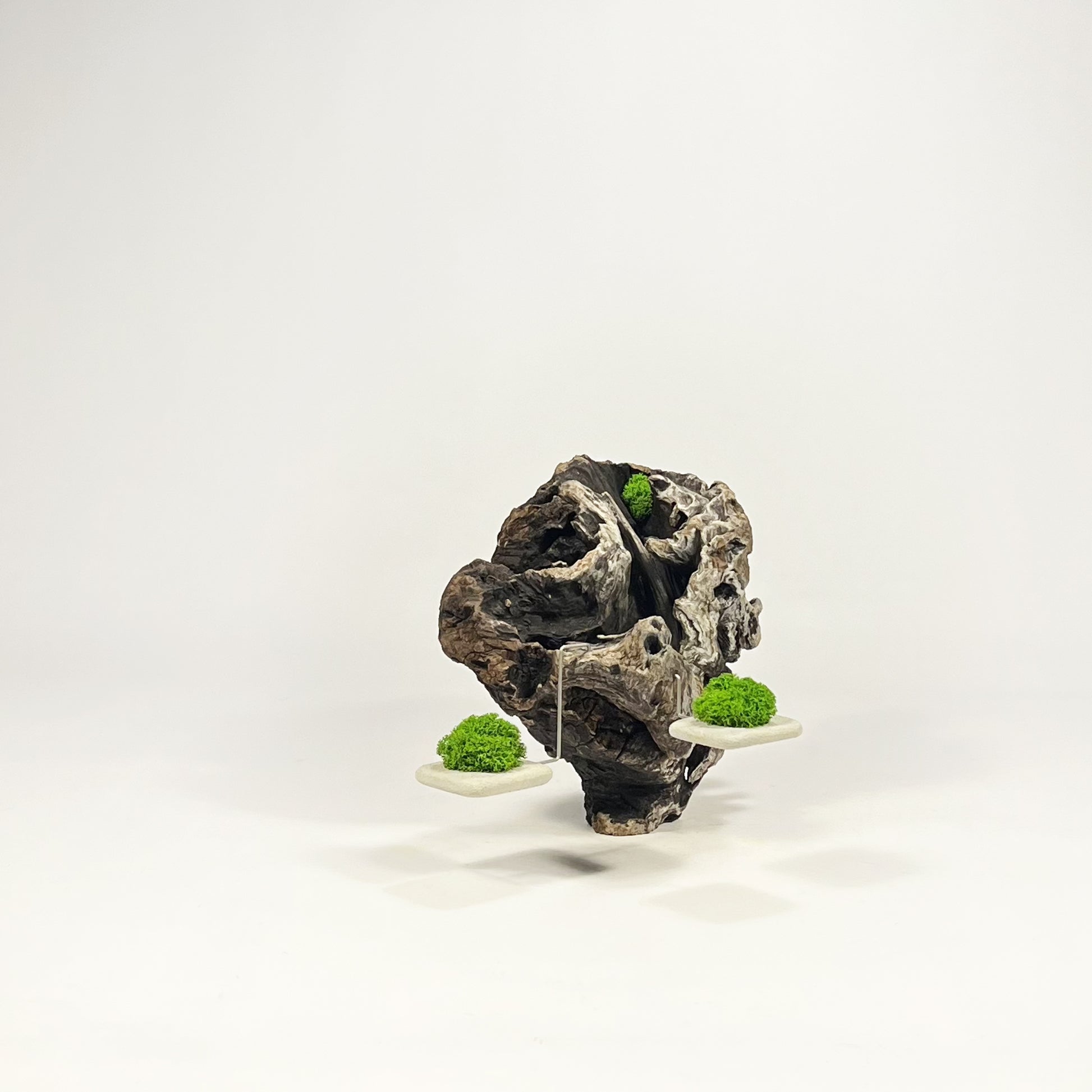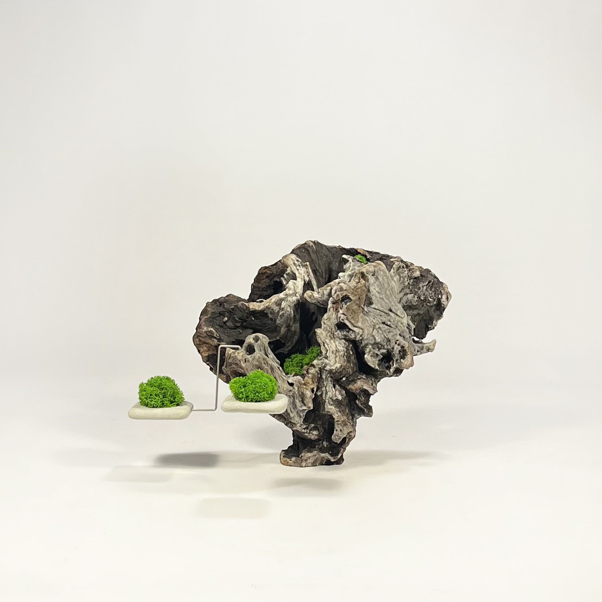Legni di mare, acciaio, muschio stabilizzato (Moss) e forme geometriche in cemento fungono da rispettivi contrappesi in un gioco di equilibrio tra naturale ed artificiale dove a vincere è solo la forza di gravità.