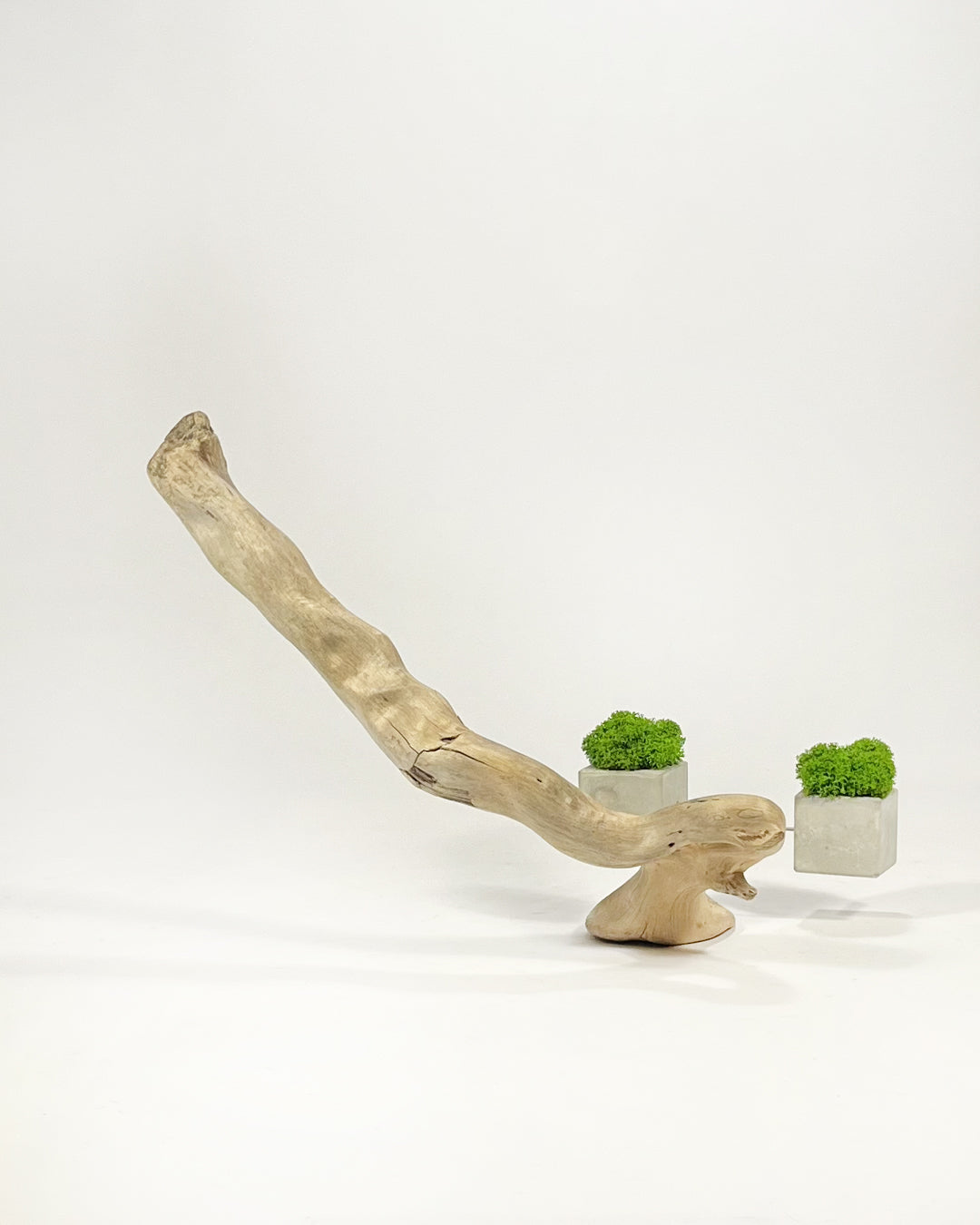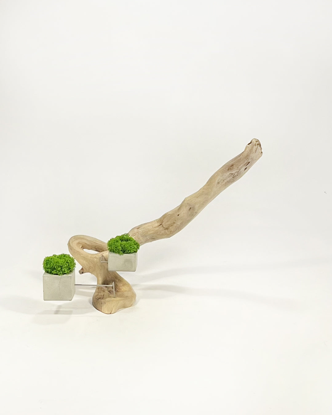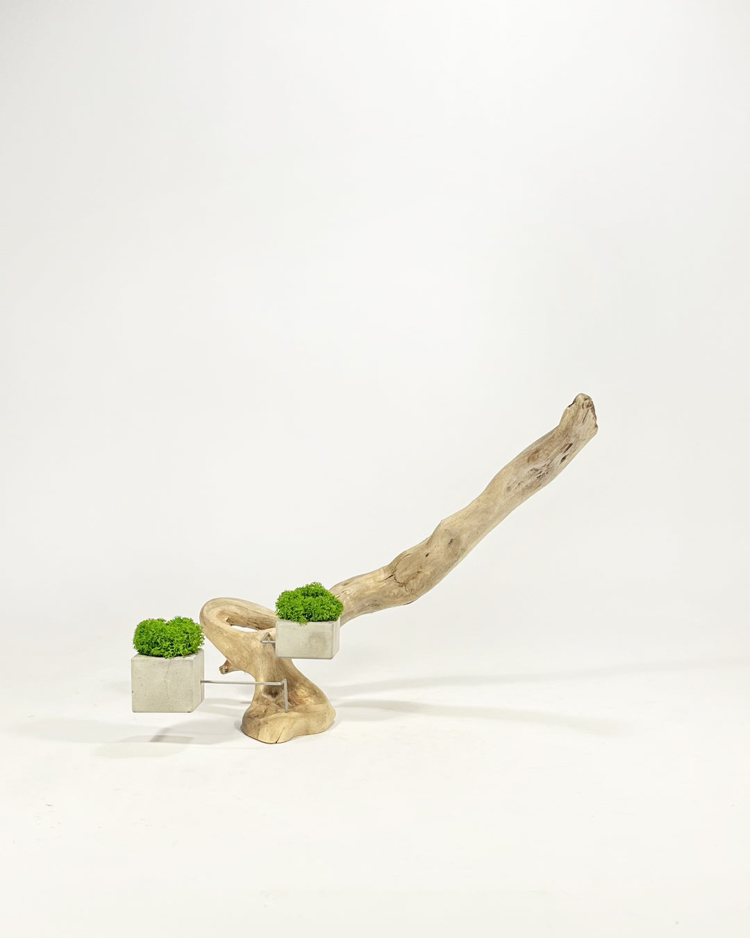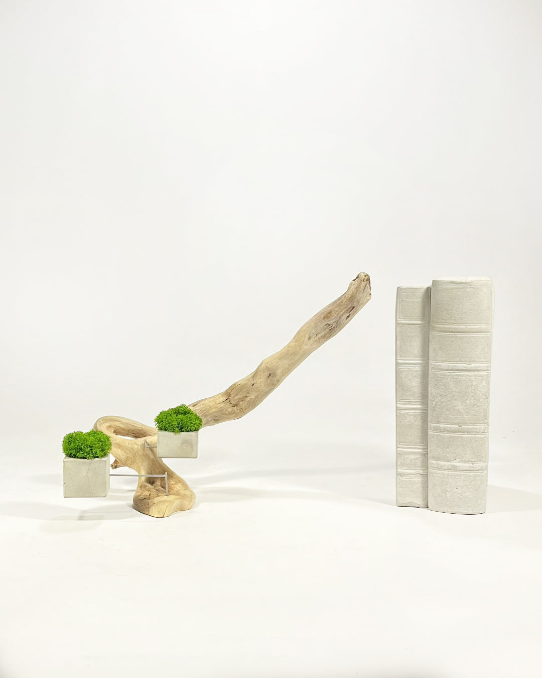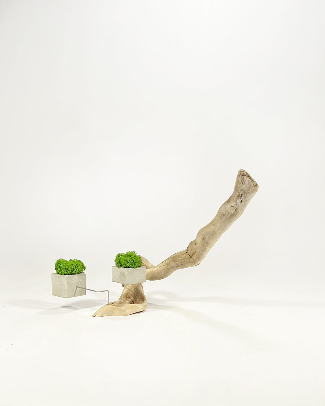 Legni di mare, acciaio, muschio stabilizzato (Moss) e forme geometriche in cemento fungono da rispettivi contrappesi in un gioco di equilibrio tra naturale ed artificiale dove a vincere è solo la forza di gravità.