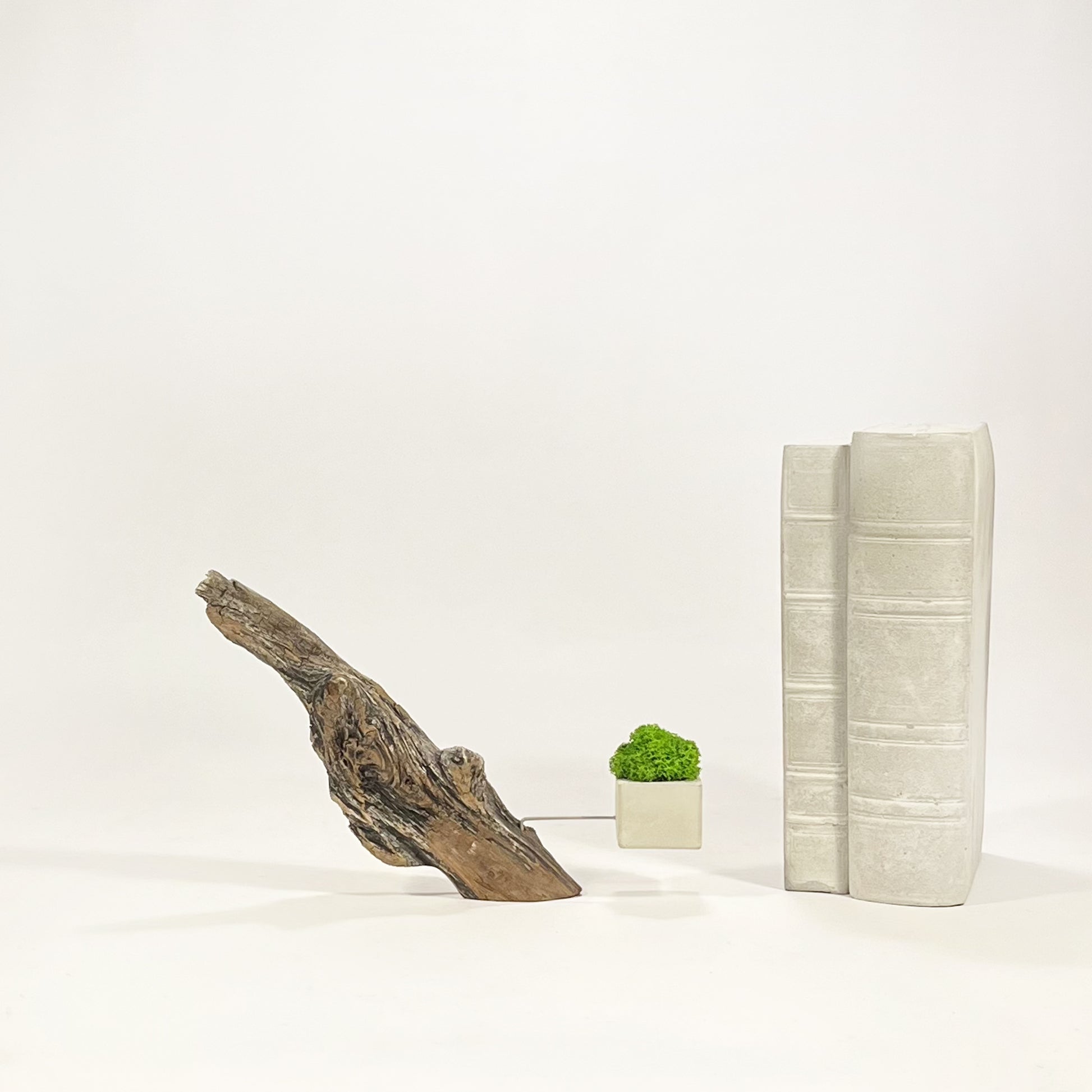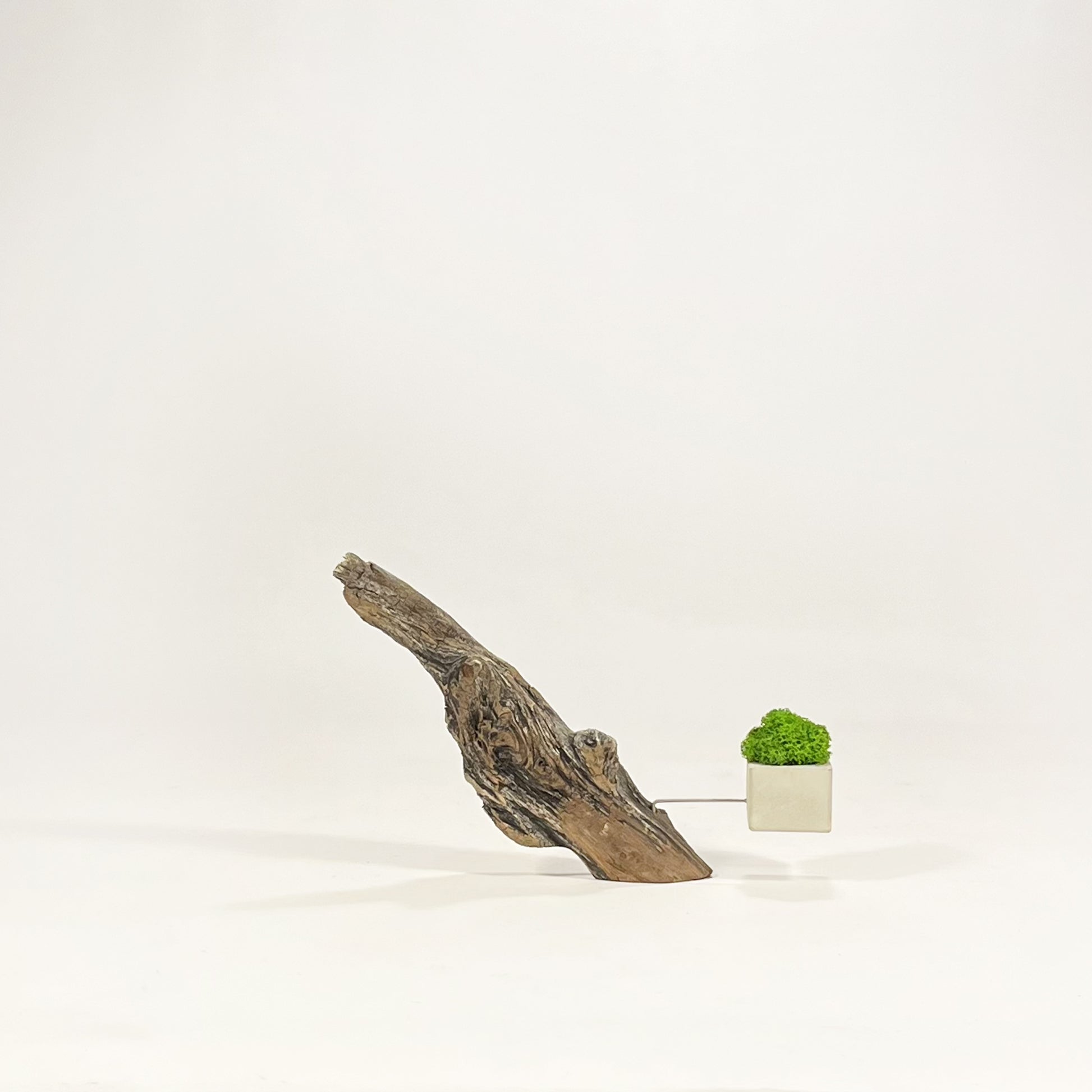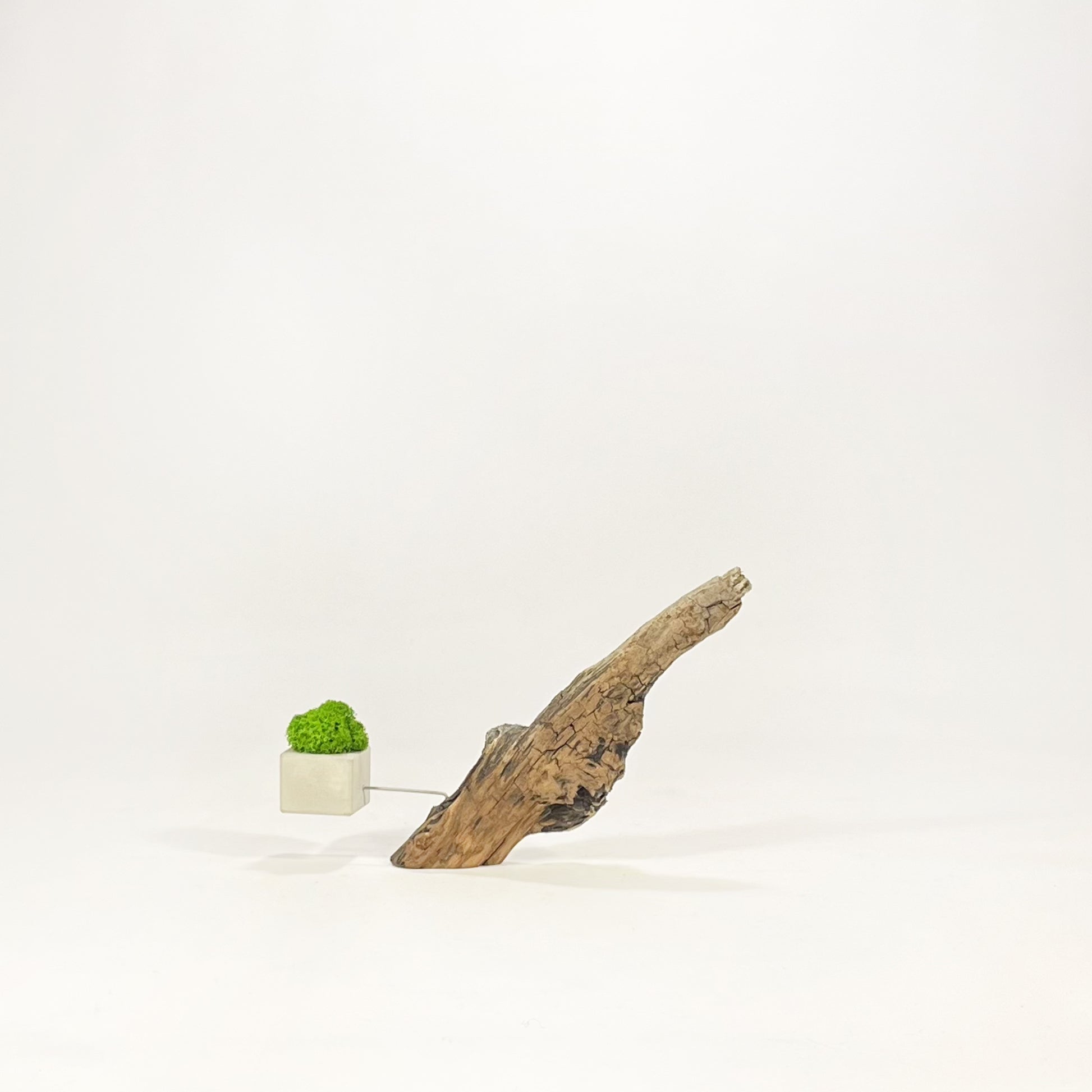 Legni di mare, acciaio, muschio stabilizzato (Moss) e forme geometriche in cemento fungono da rispettivi contrappesi in un gioco di equilibrio tra naturale ed artificiale dove a vincere è solo la forza di gravità.