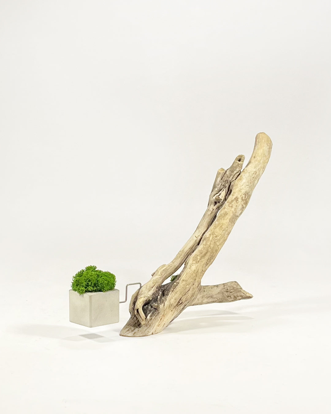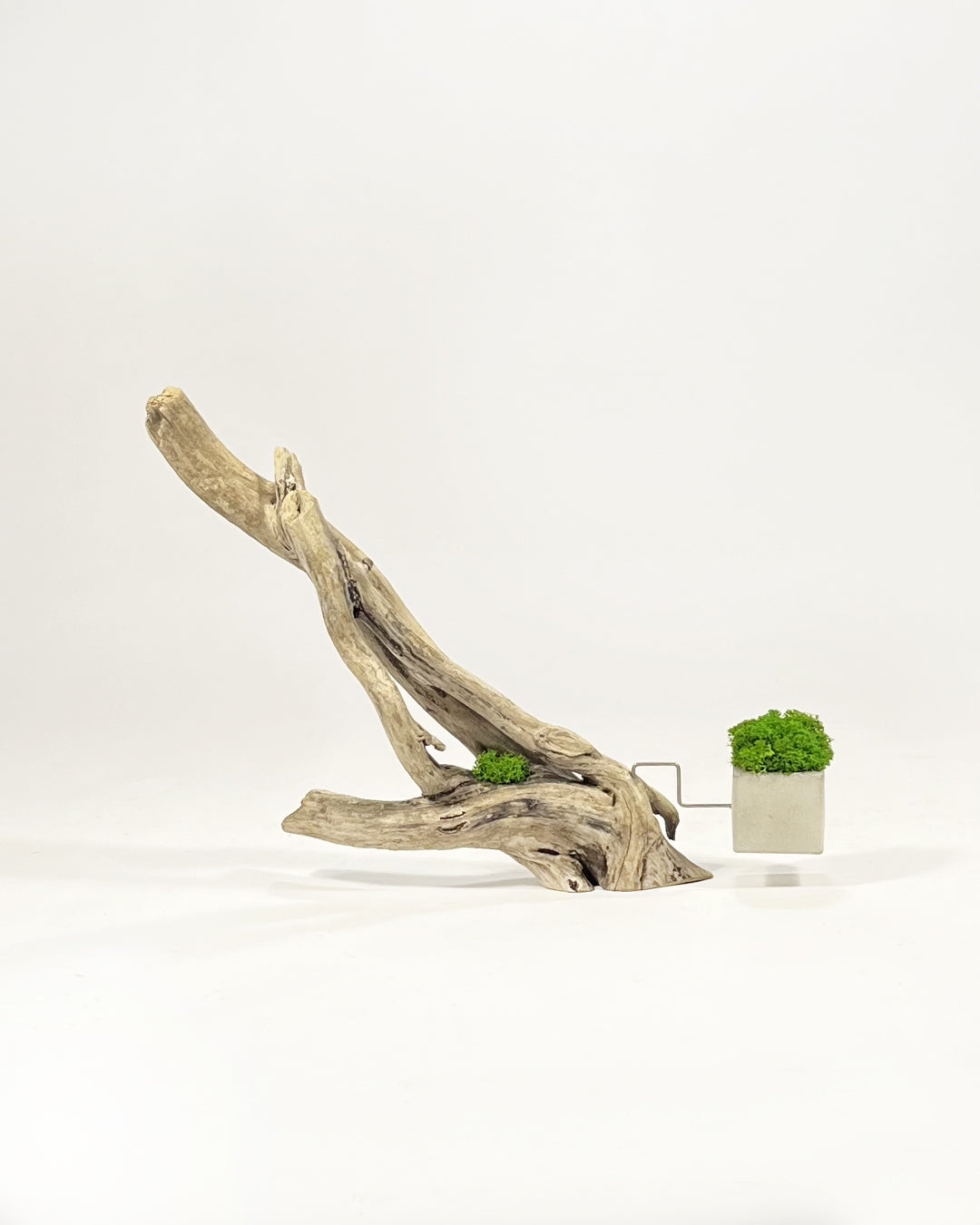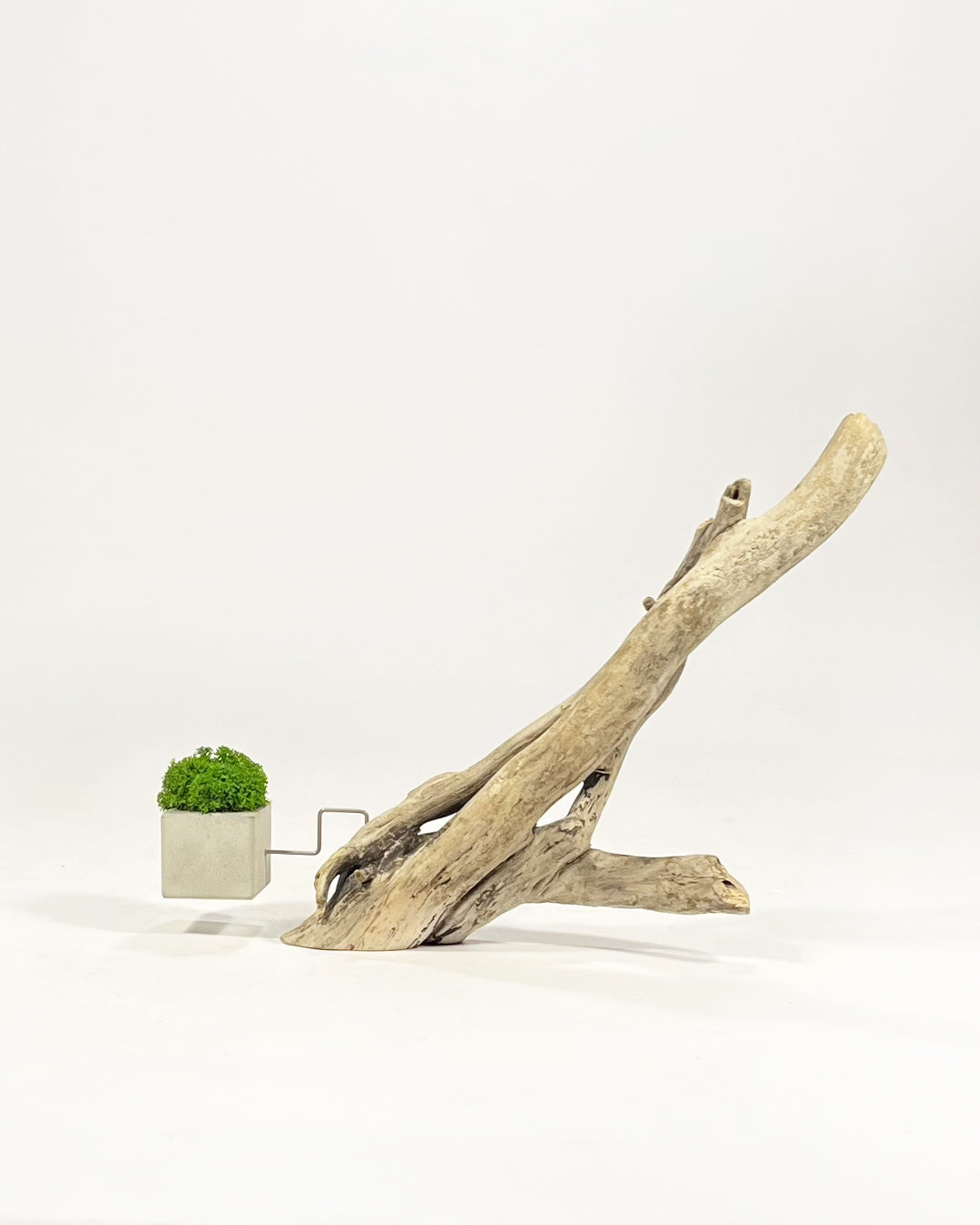 Legni di mare, acciaio, muschio stabilizzato (Moss) e forme geometriche in cemento fungono da rispettivi contrappesi in un gioco di equilibrio tra naturale ed artificiale dove a vincere è solo la forza di gravità.