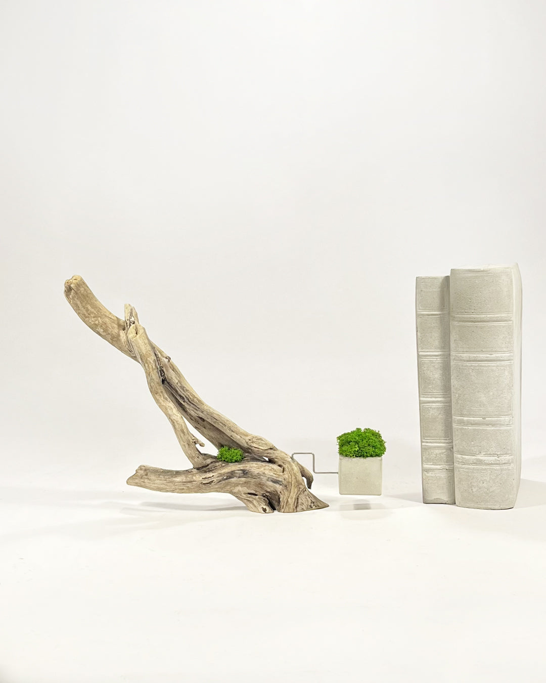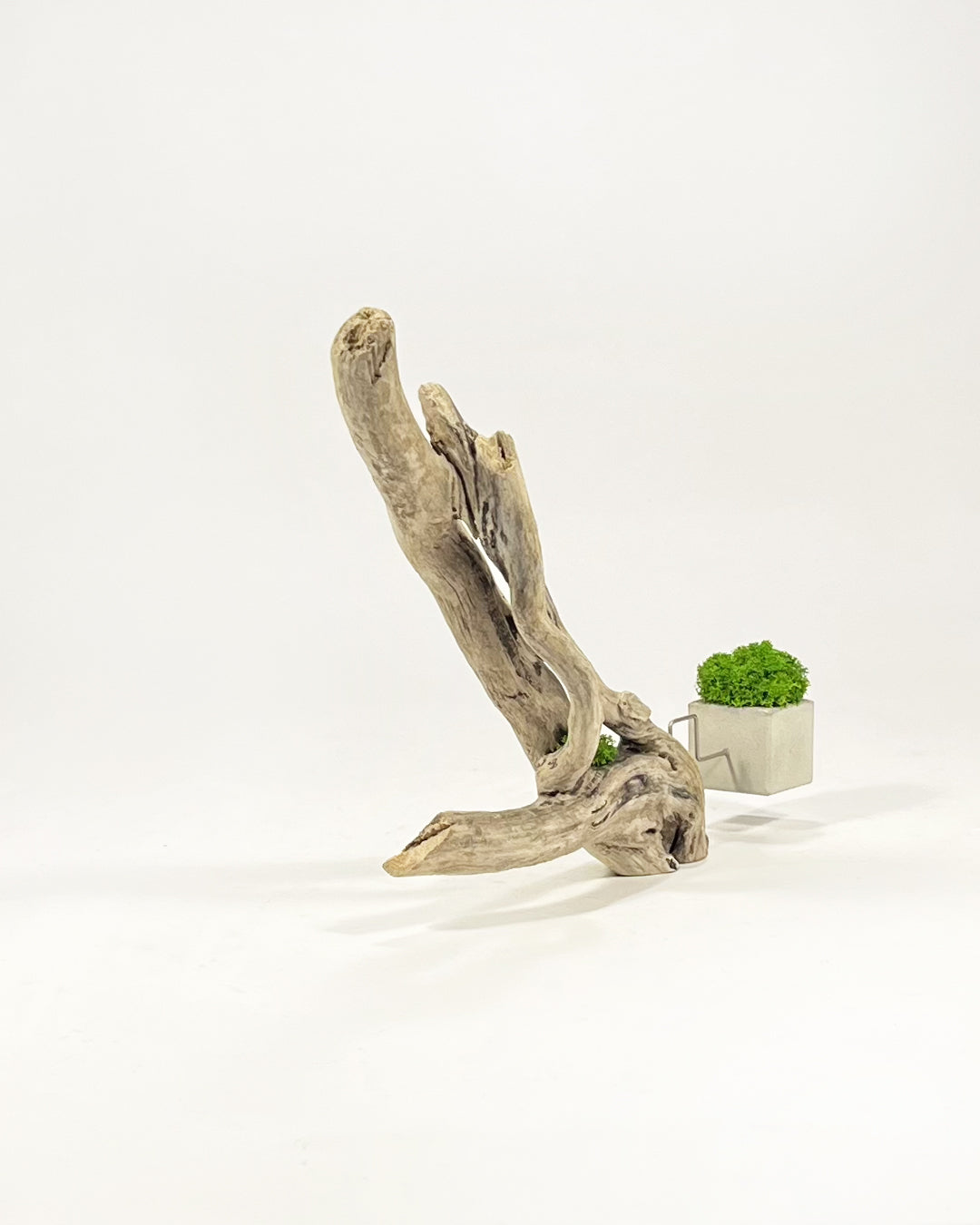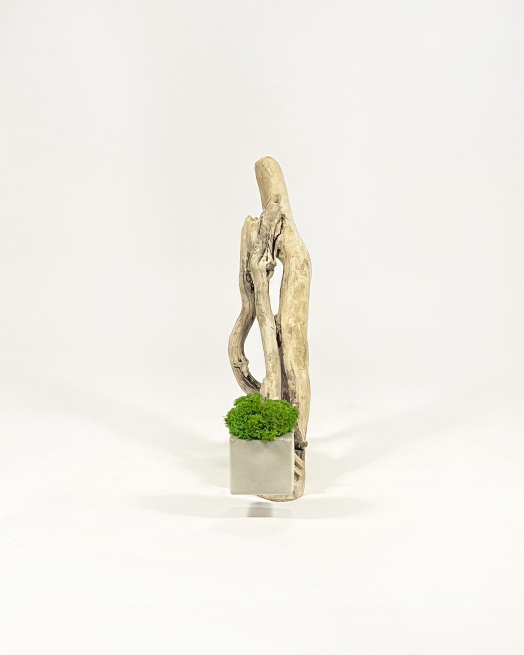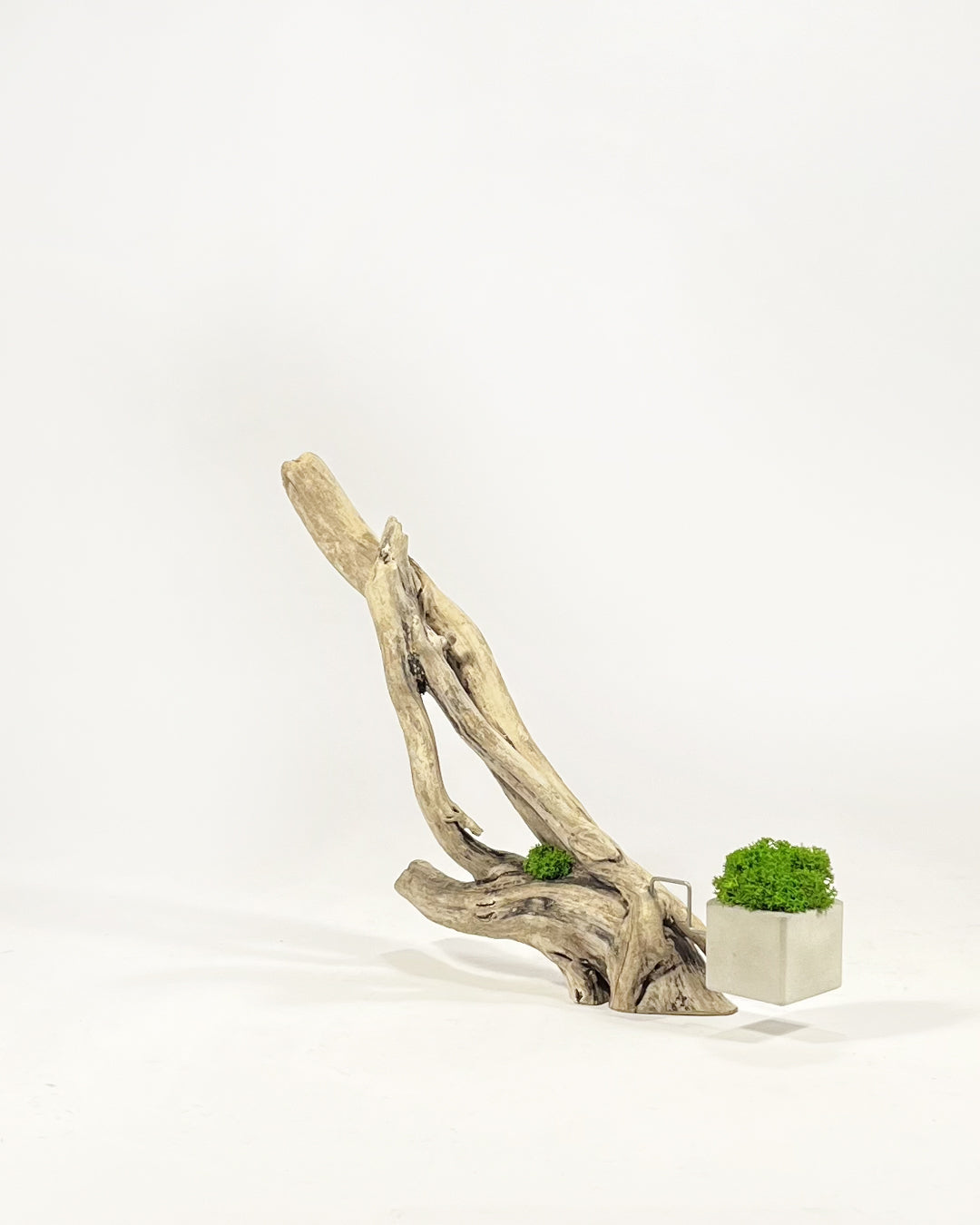 Legni di mare, acciaio, muschio stabilizzato (Moss) e forme geometriche in cemento fungono da rispettivi contrappesi in un gioco di equilibrio tra naturale ed artificiale dove a vincere è solo la forza di gravità.