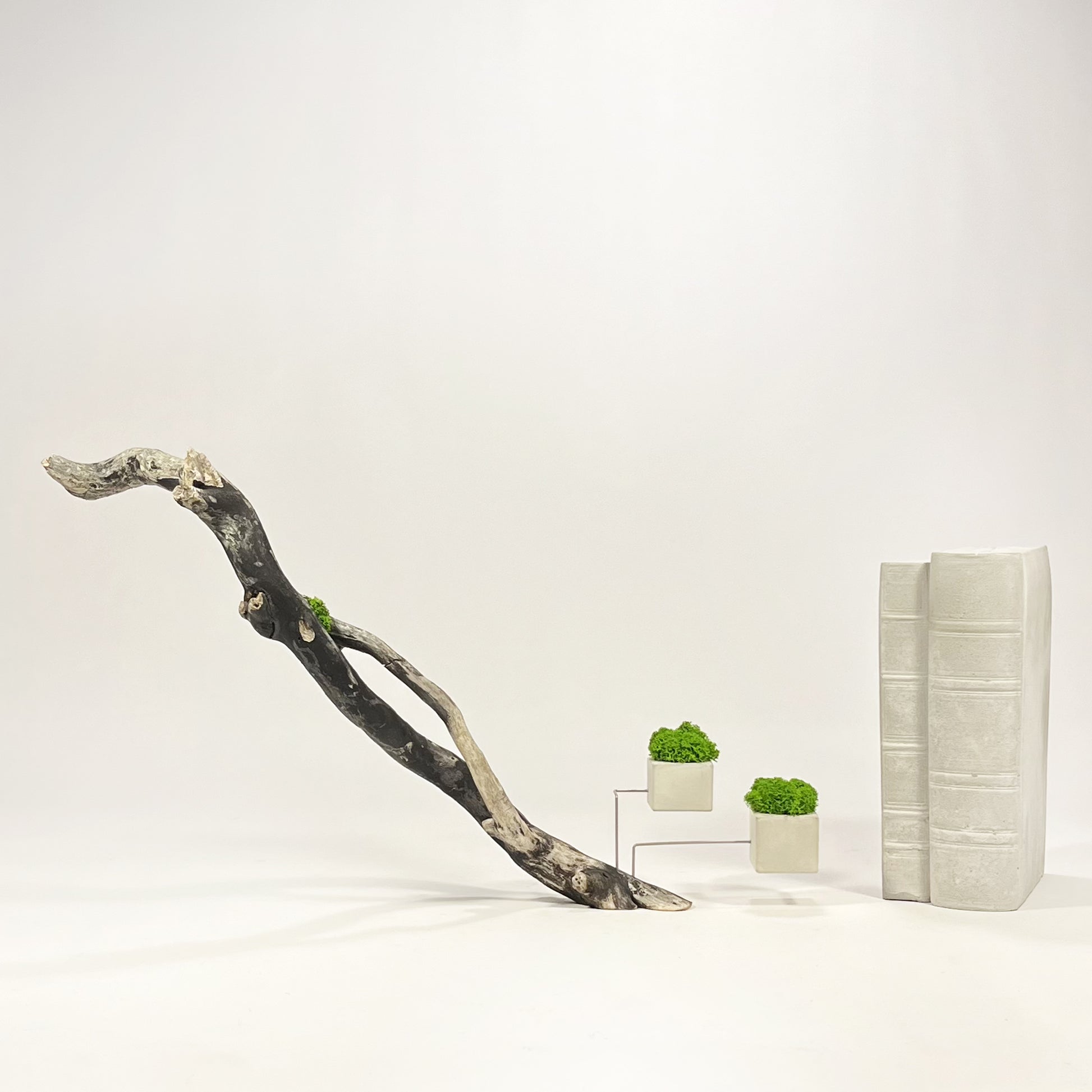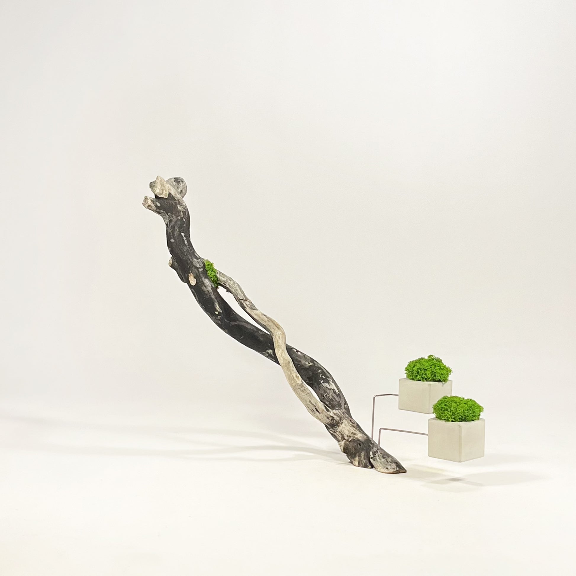 Legni di mare, acciaio, muschio stabilizzato (Moss) e forme geometriche in cemento fungono da rispettivi contrappesi in un gioco di equilibrio tra naturale ed artificiale dove a vincere è solo la forza di gravità.