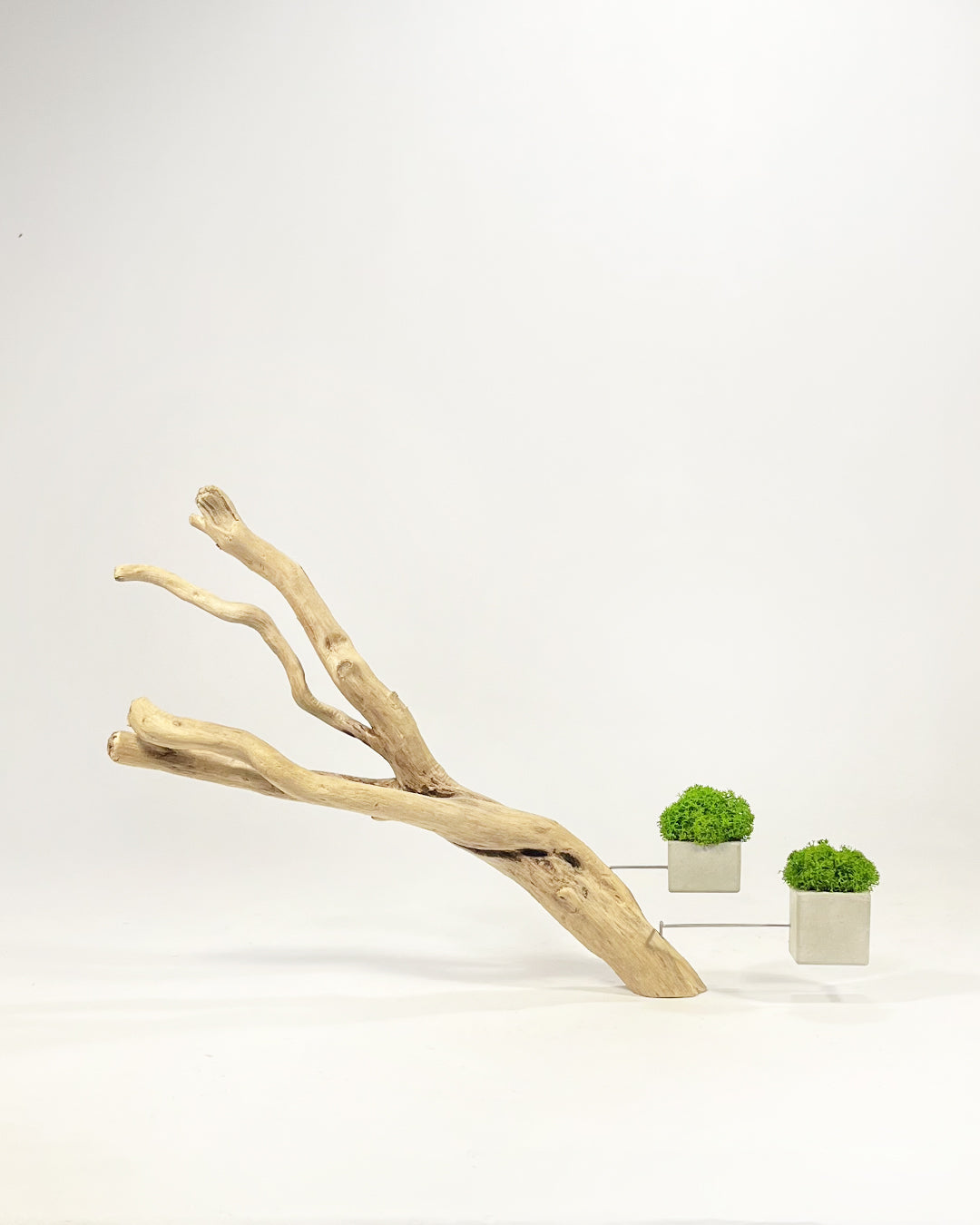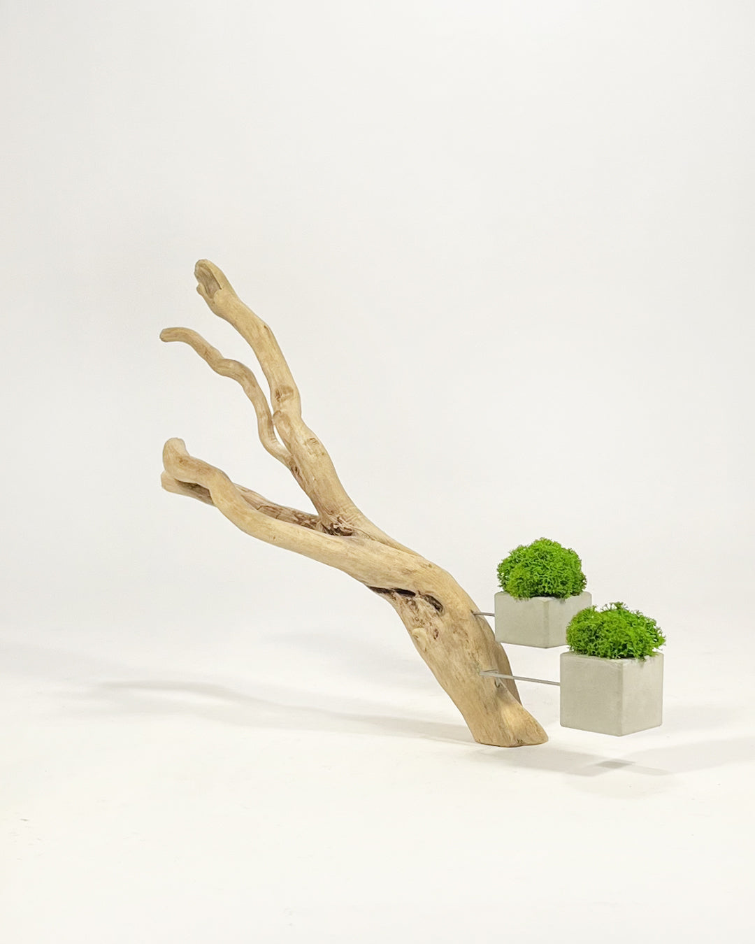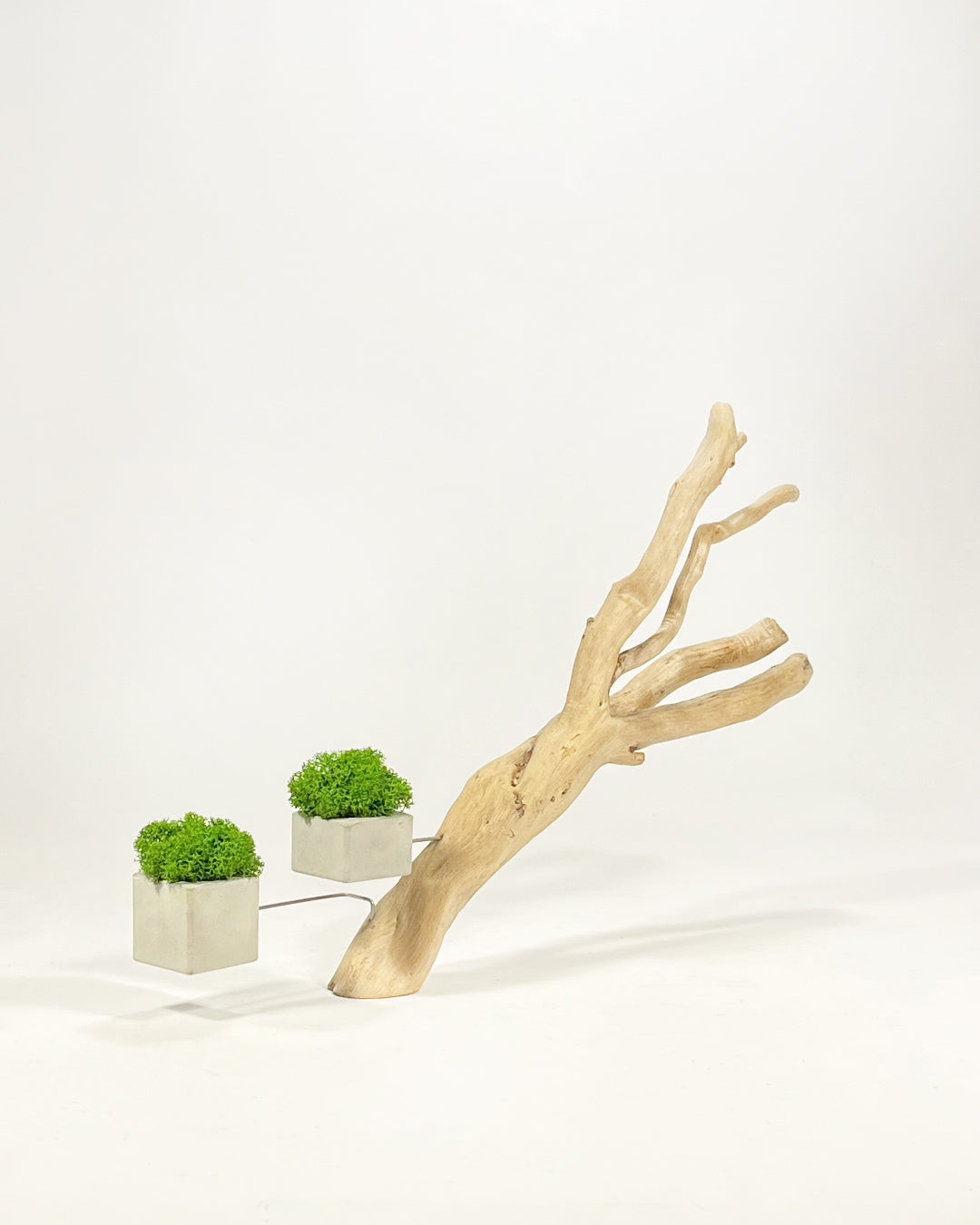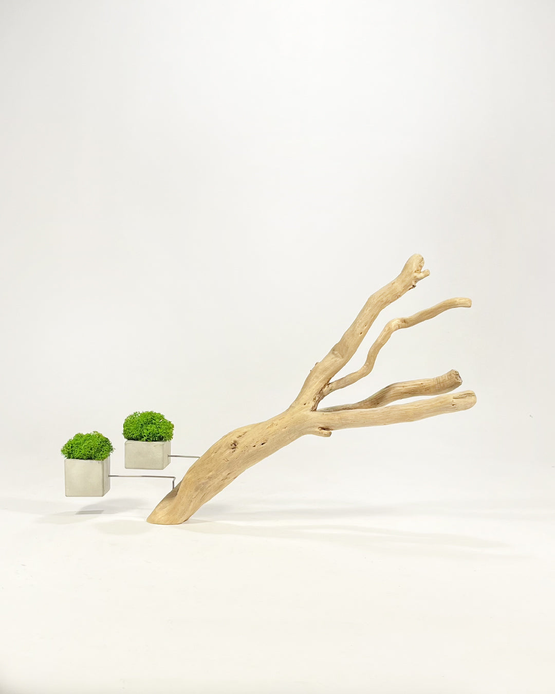Legni di mare, acciaio, muschio stabilizzato (Moss) e forme geometriche in cemento fungono da rispettivi contrappesi in un gioco di equilibrio tra naturale ed artificiale dove a vincere è solo la forza di gravità.
