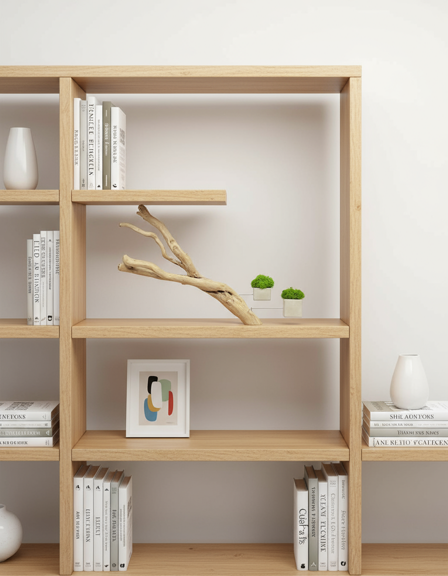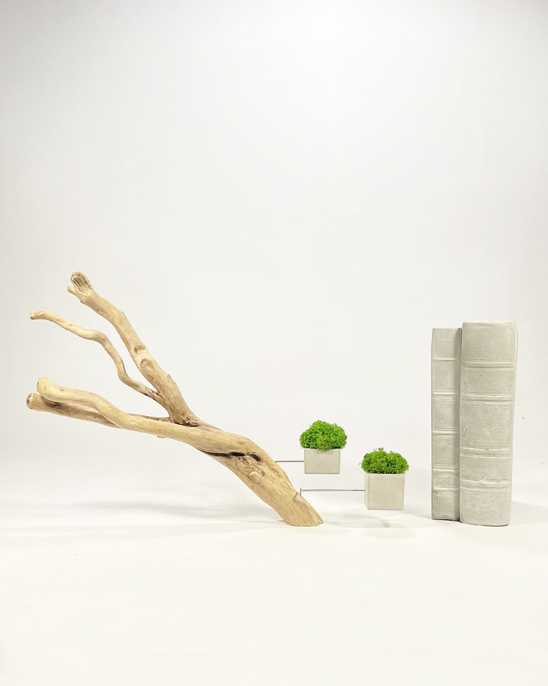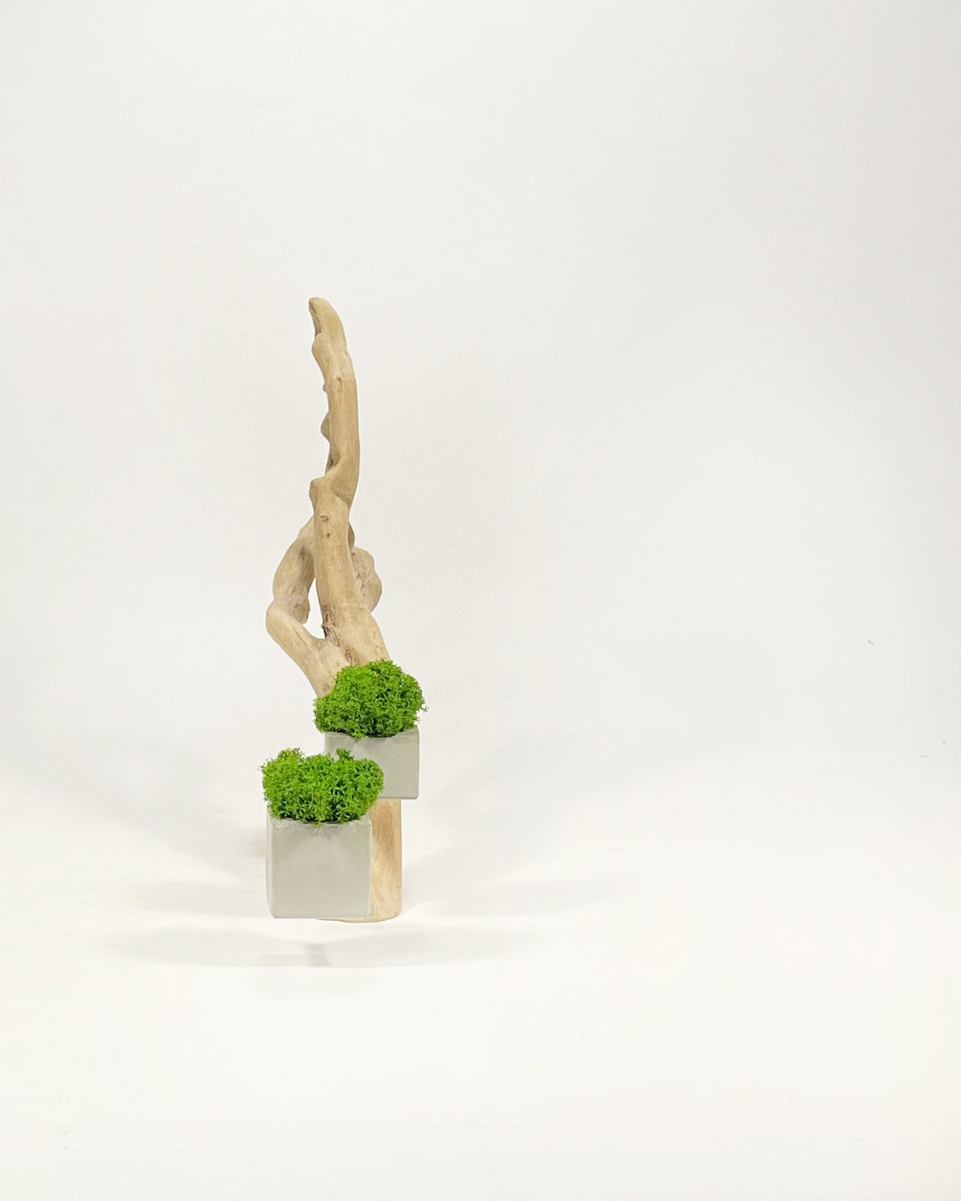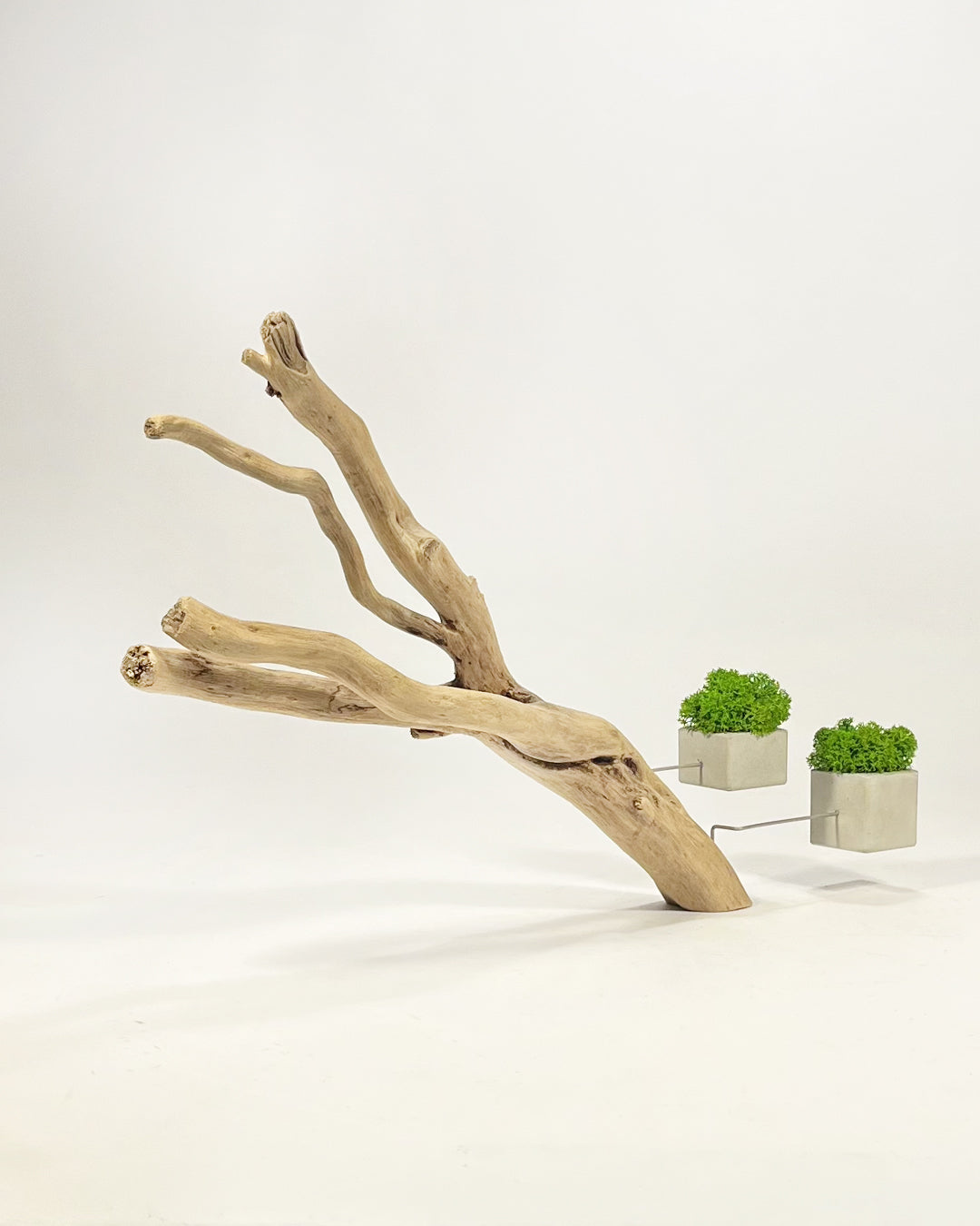 Legni di mare, acciaio, muschio stabilizzato (Moss) e forme geometriche in cemento fungono da rispettivi contrappesi in un gioco di equilibrio tra naturale ed artificiale dove a vincere è solo la forza di gravità.