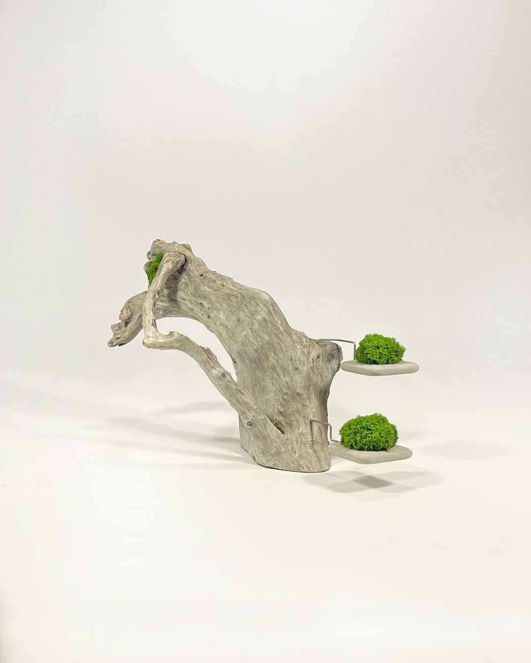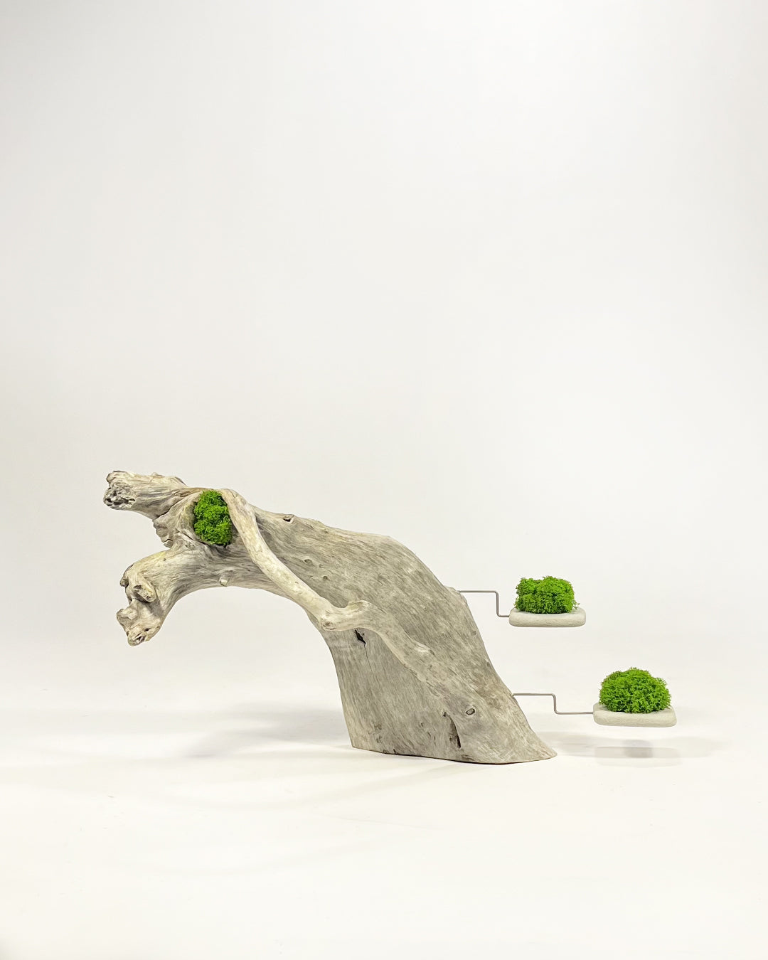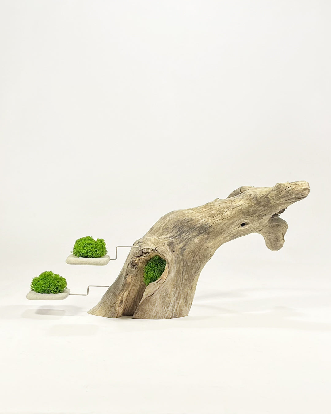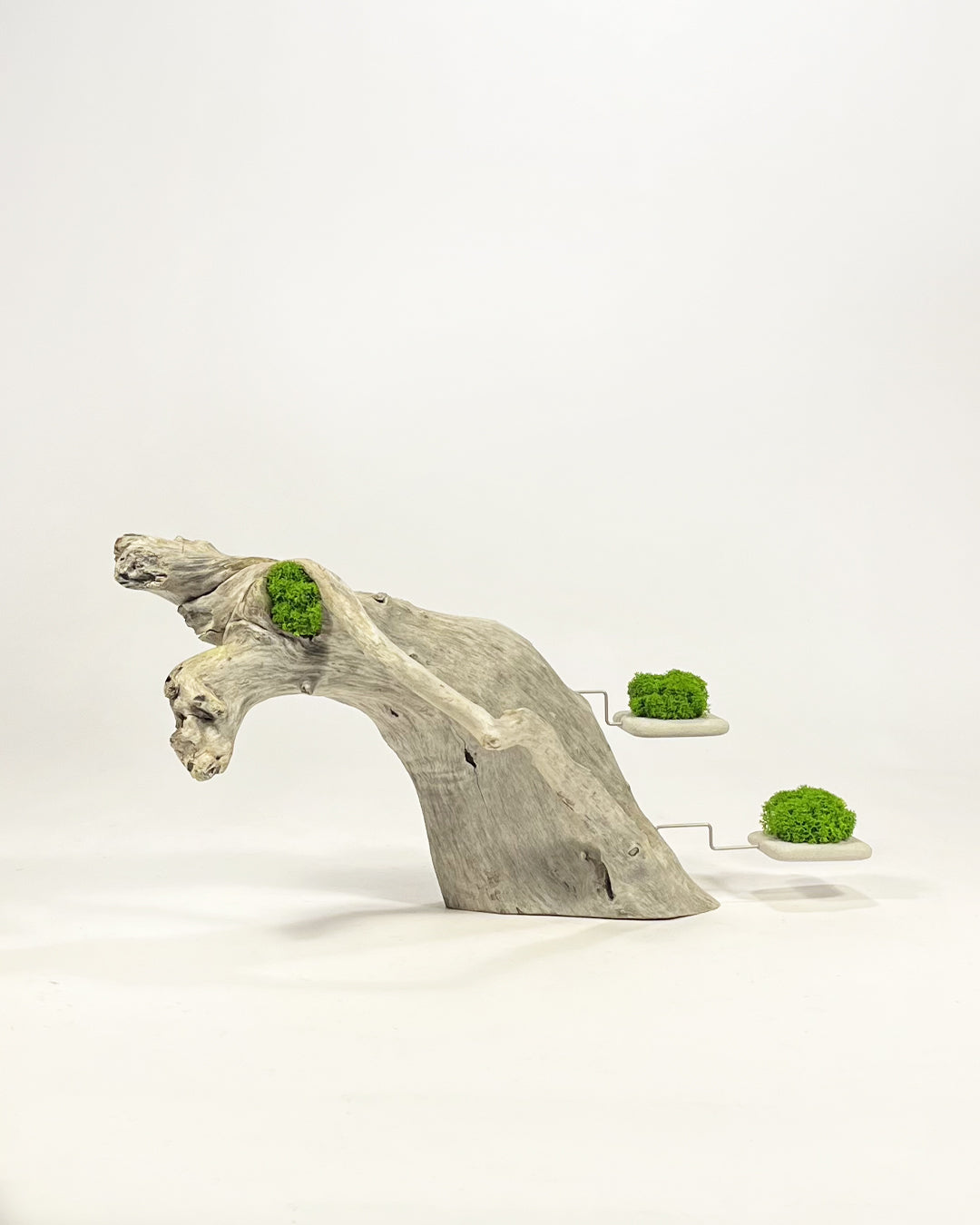 Legni di mare, acciaio, muschio stabilizzato (Moss) e forme geometriche in cemento fungono da rispettivi contrappesi in un gioco di equilibrio tra naturale ed artificiale dove a vincere è solo la forza di gravità.
