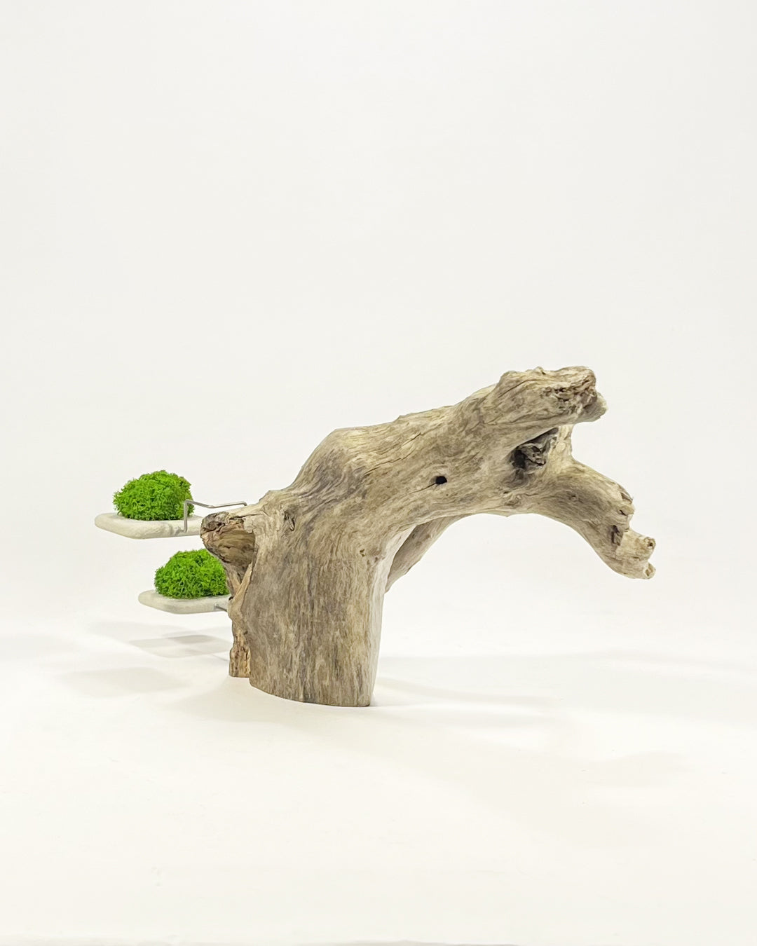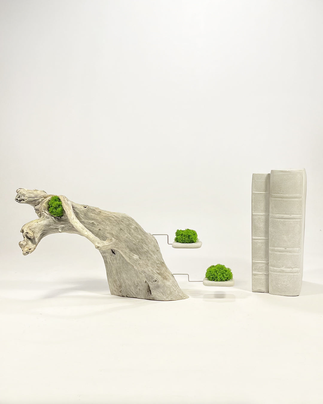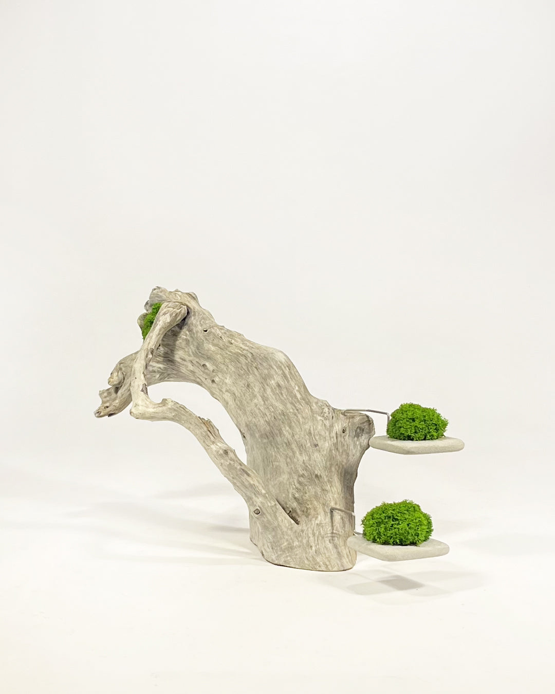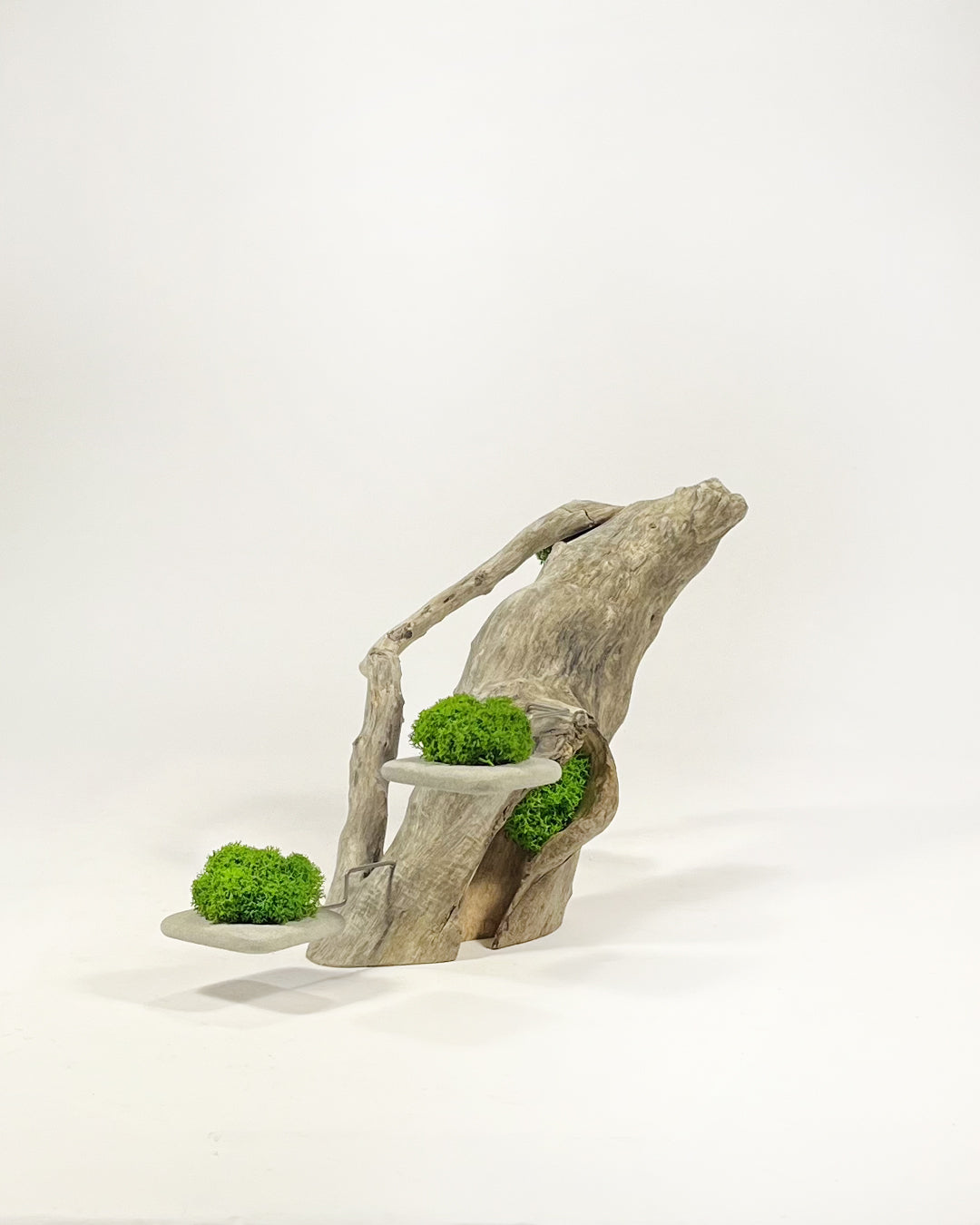 Legni di mare, acciaio, muschio stabilizzato (Moss) e forme geometriche in cemento fungono da rispettivi contrappesi in un gioco di equilibrio tra naturale ed artificiale dove a vincere è solo la forza di gravità.