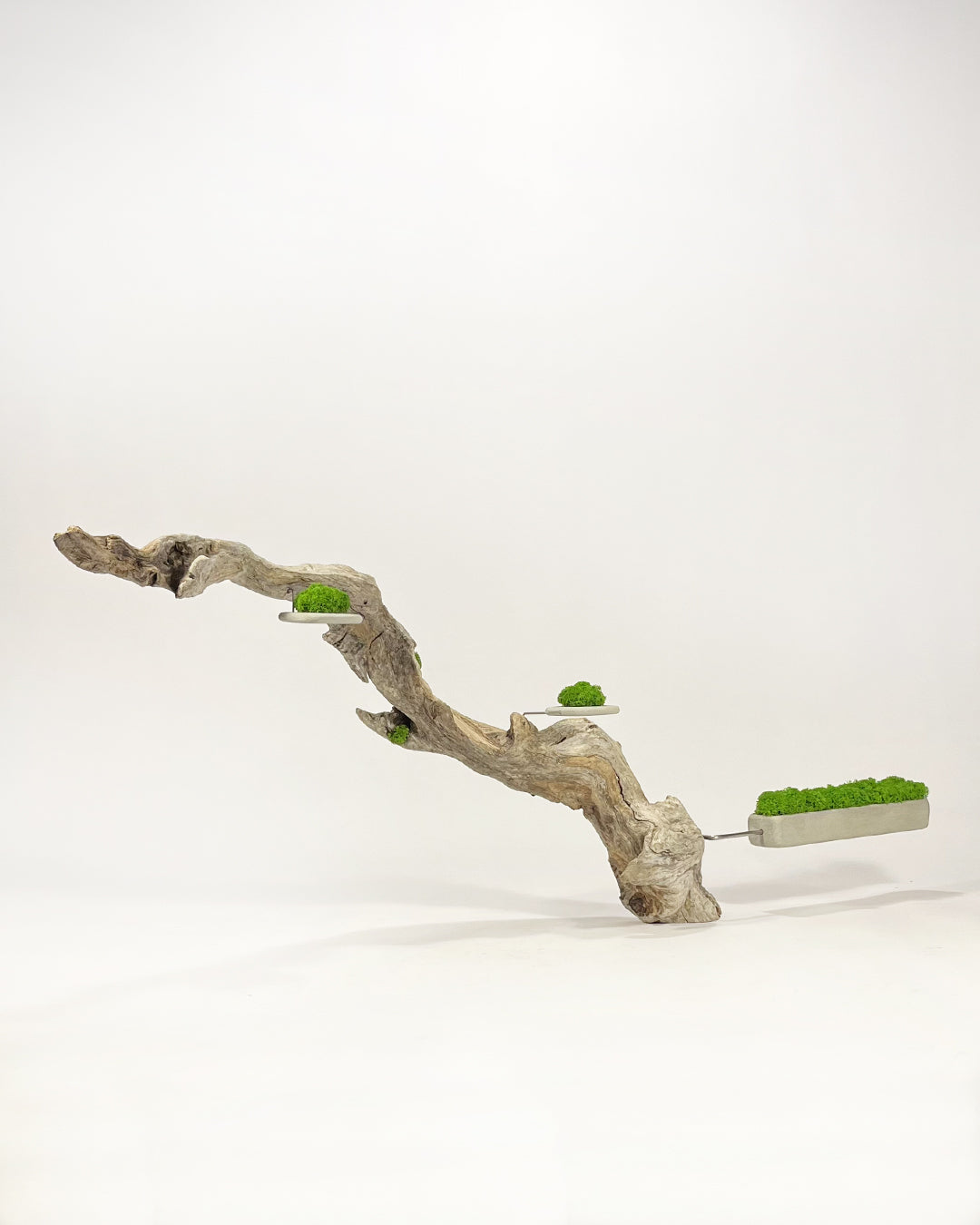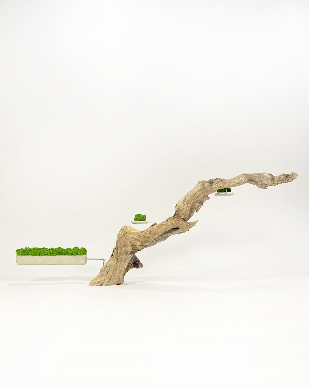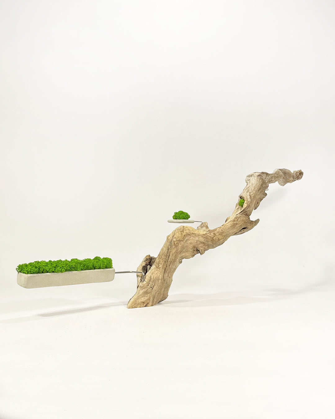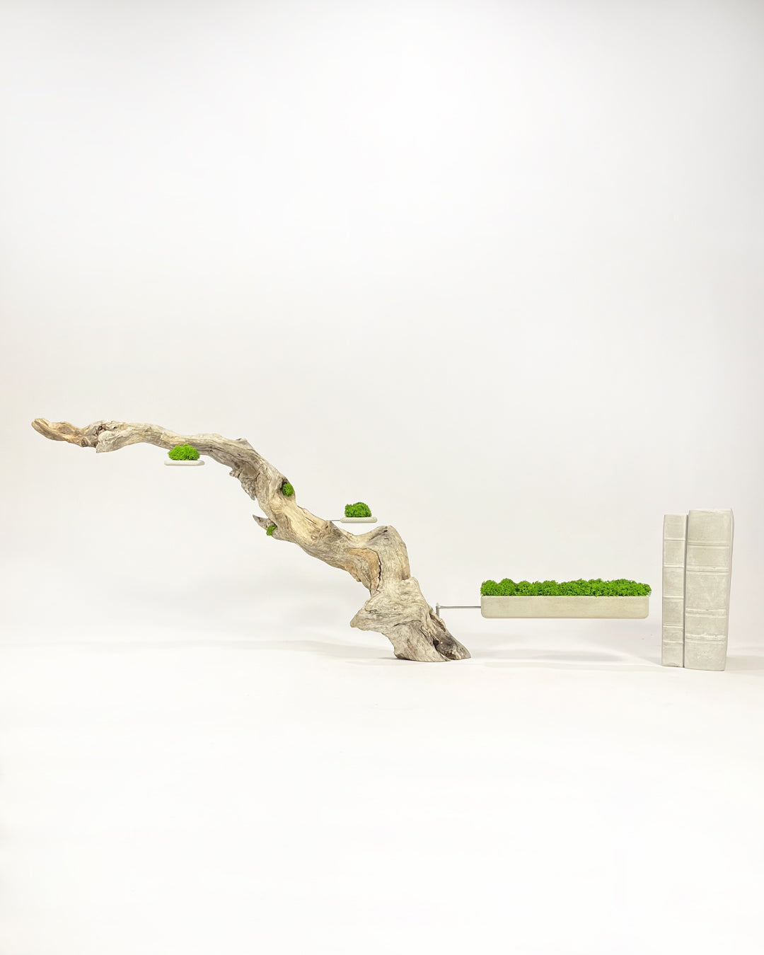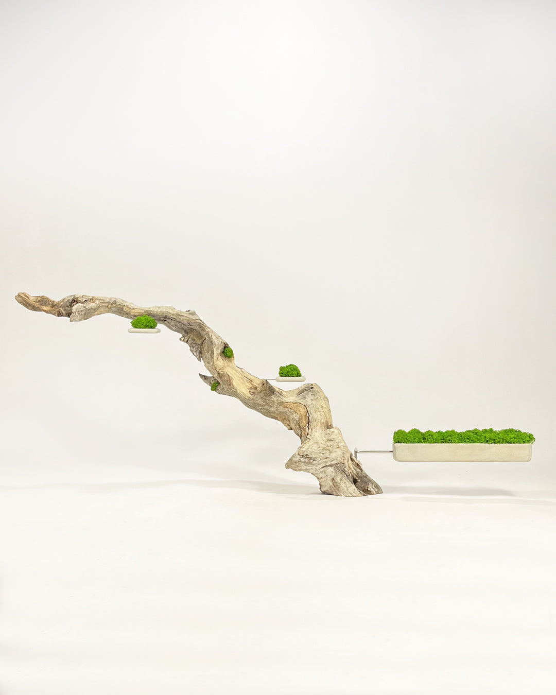 Legni di mare, acciaio, muschio stabilizzato (Moss) e forme geometriche in cemento fungono da rispettivi contrappesi in un gioco di equilibrio tra naturale ed artificiale dove a vincere è solo la forza di gravità.