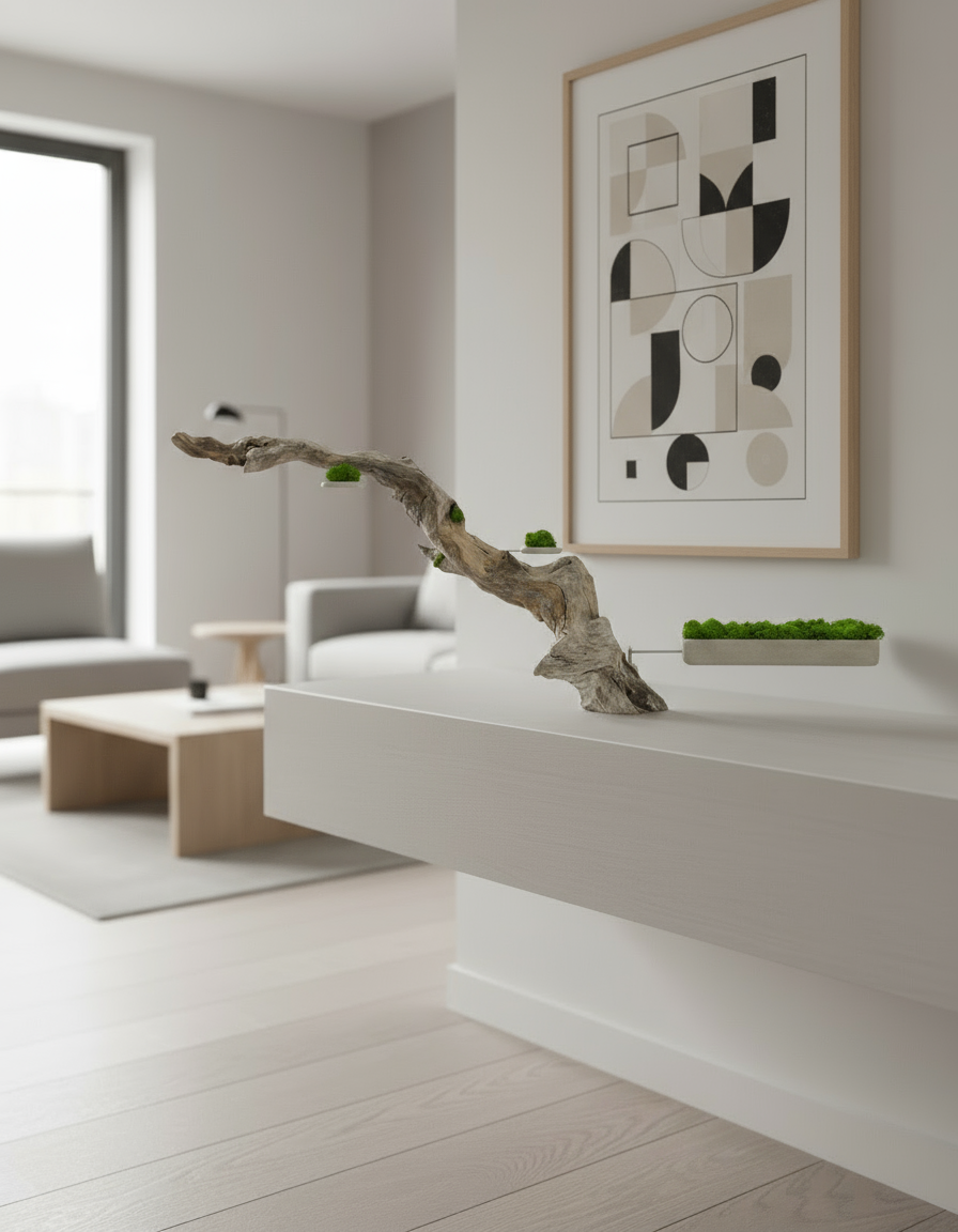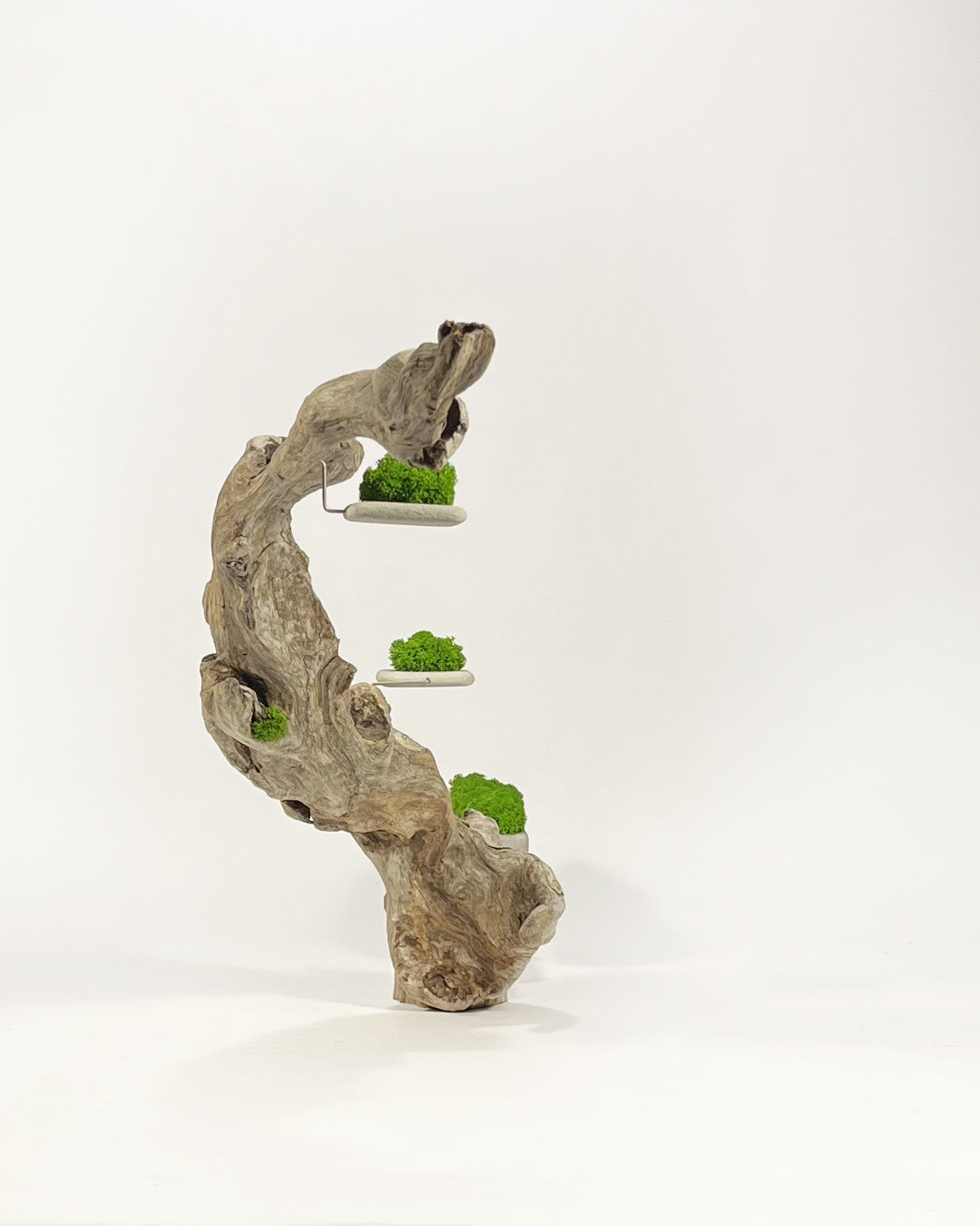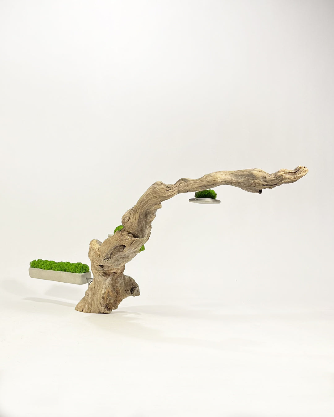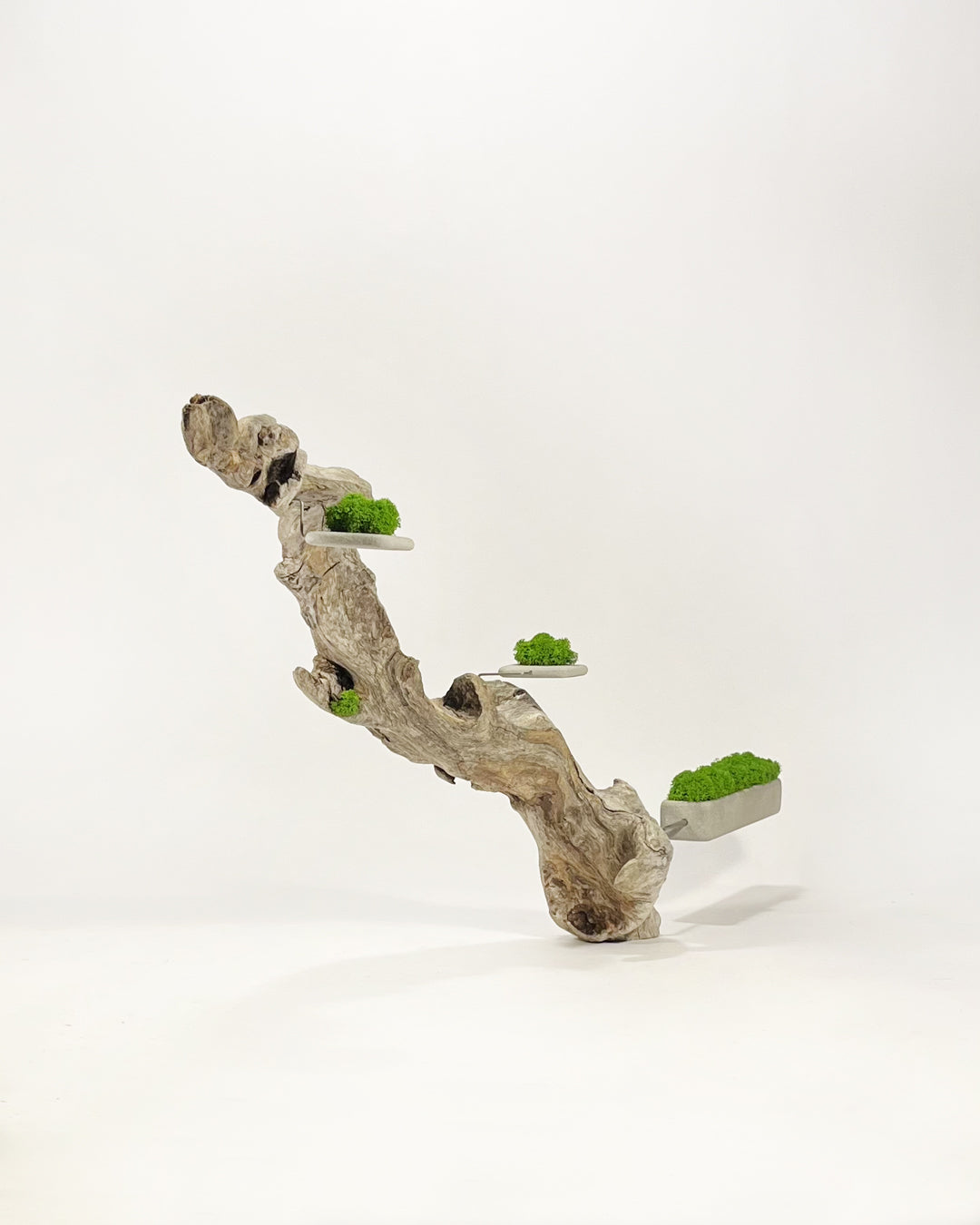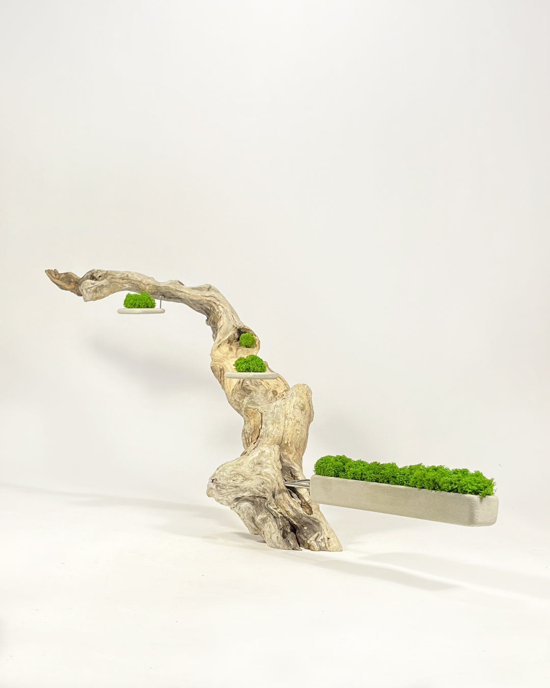 Legni di mare, acciaio, muschio stabilizzato (Moss) e forme geometriche in cemento fungono da rispettivi contrappesi in un gioco di equilibrio tra naturale ed artificiale dove a vincere è solo la forza di gravità.