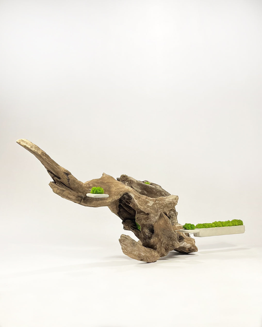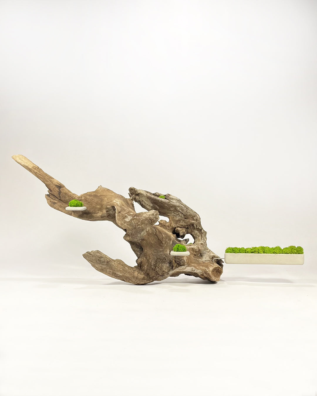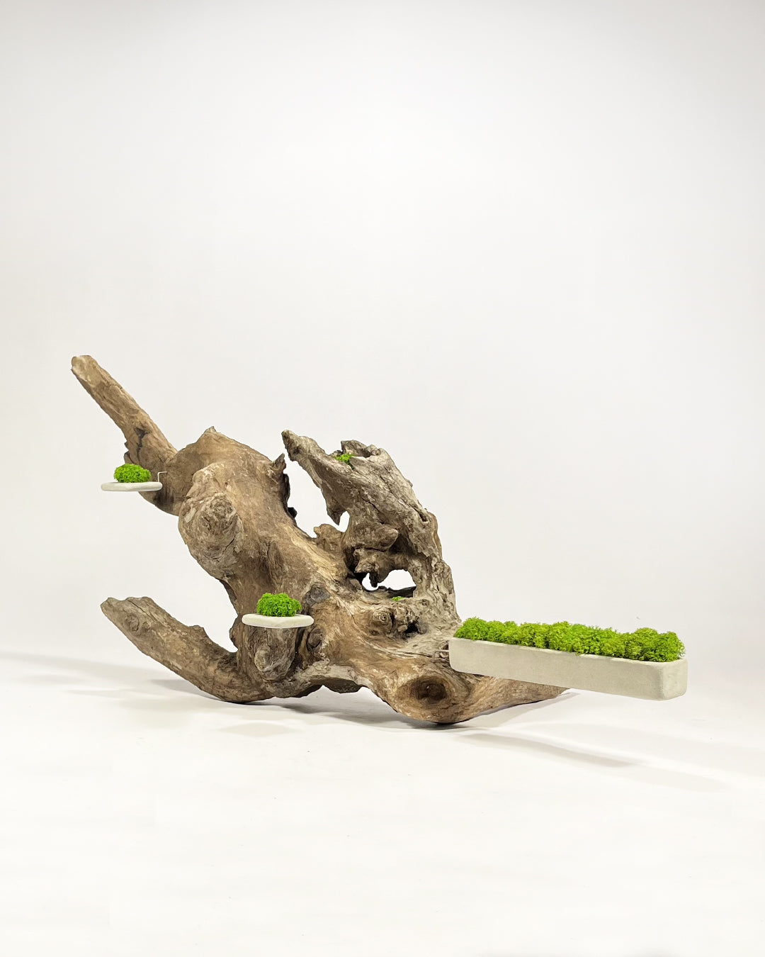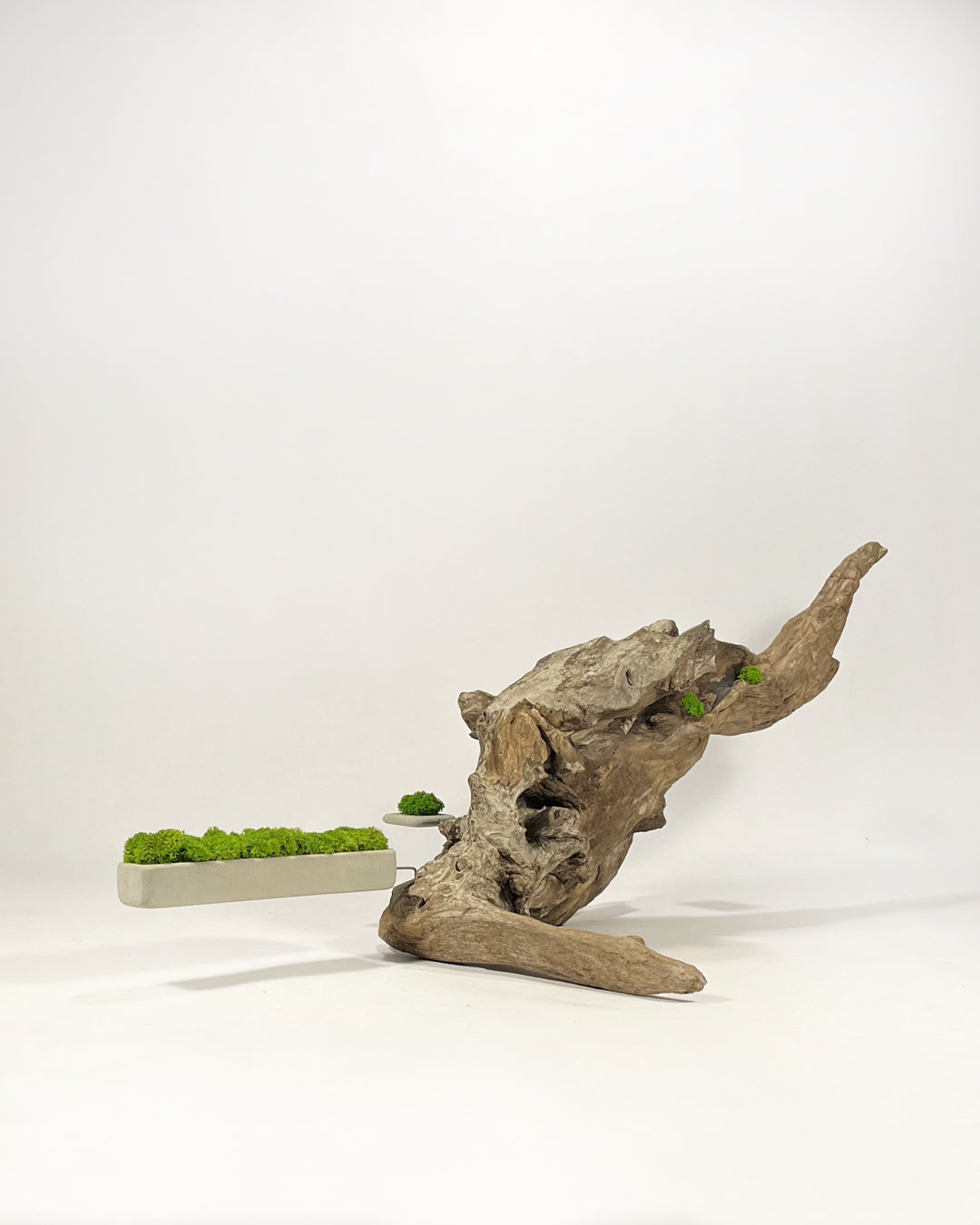 Legni di mare, acciaio, muschio stabilizzato (Moss) e forme geometriche in cemento fungono da rispettivi contrappesi in un gioco di equilibrio tra naturale ed artificiale dove a vincere è solo la forza di gravità.