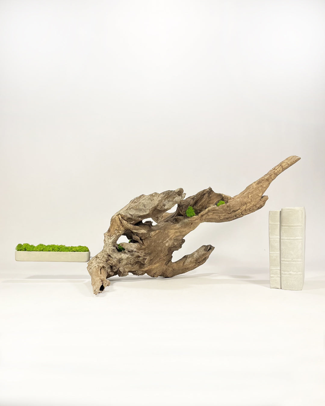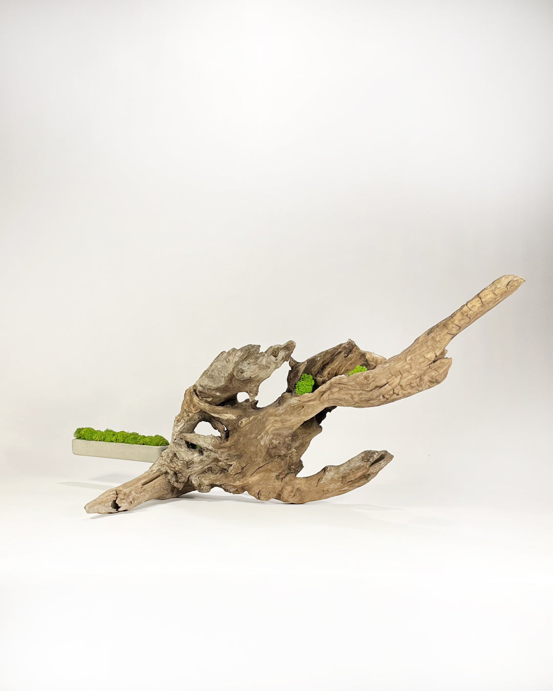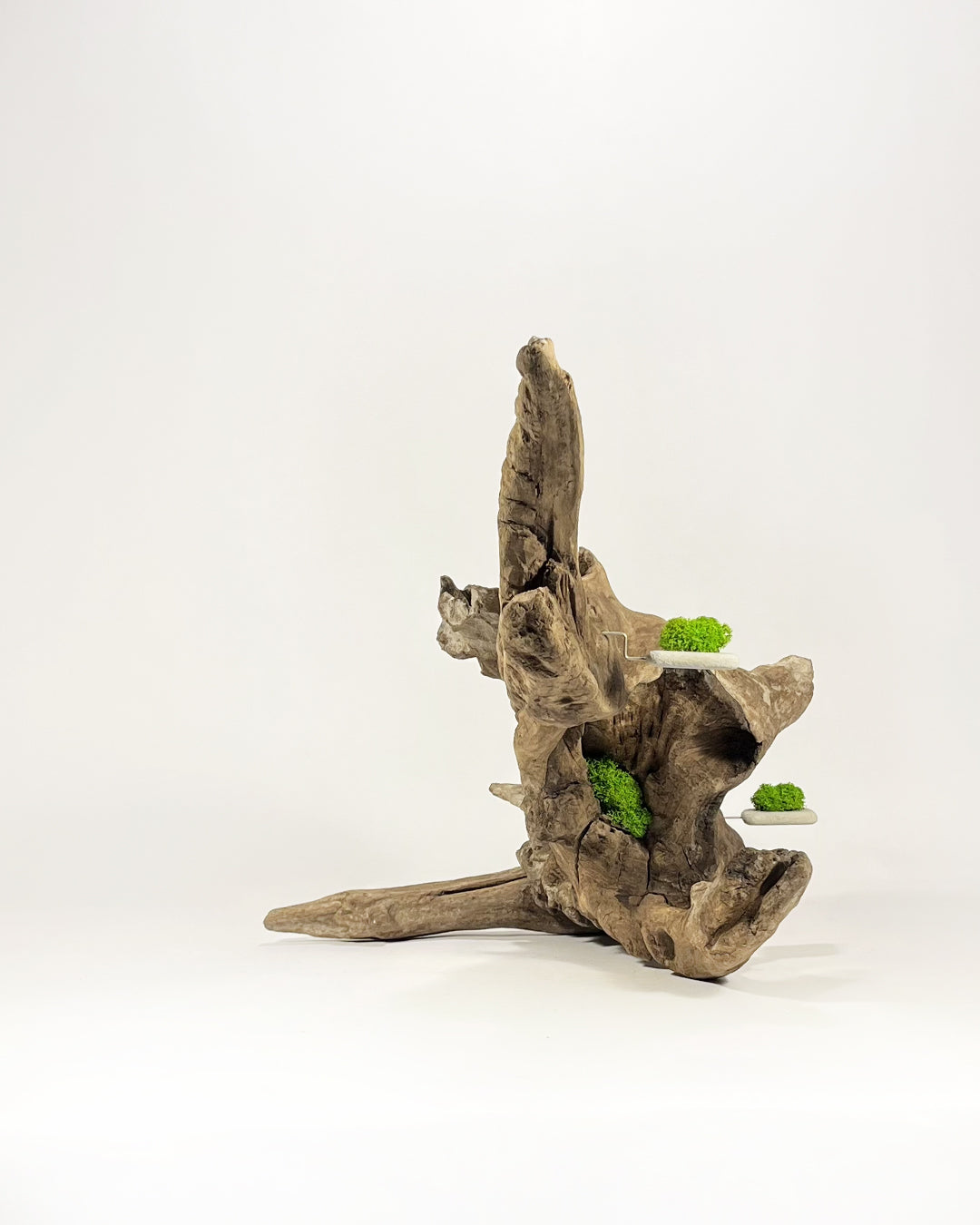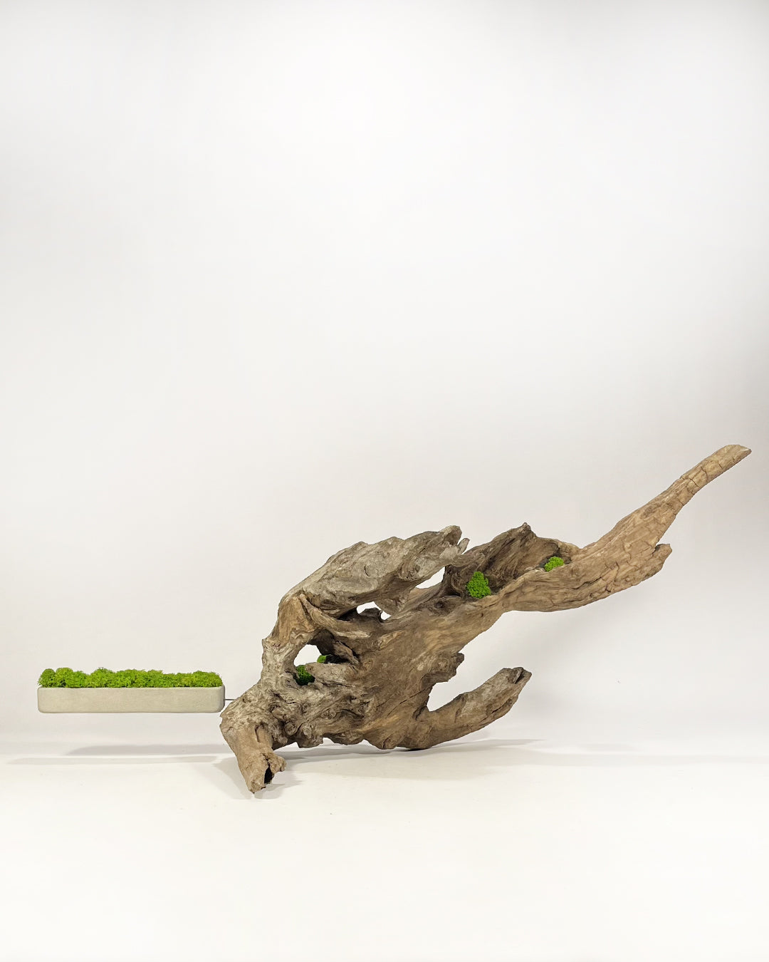 Legni di mare, acciaio, muschio stabilizzato (Moss) e forme geometriche in cemento fungono da rispettivi contrappesi in un gioco di equilibrio tra naturale ed artificiale dove a vincere è solo la forza di gravità.